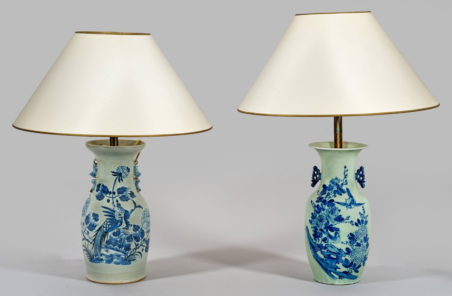 Porzellan. Vasen mit Zierhenkeln und Malerei in Unterglasurblau. Lampenschirme aus hellem Kunststoff, rund und oben offen. Elektrifiziert. Minim. best.; Gesamt-H. 85 cm