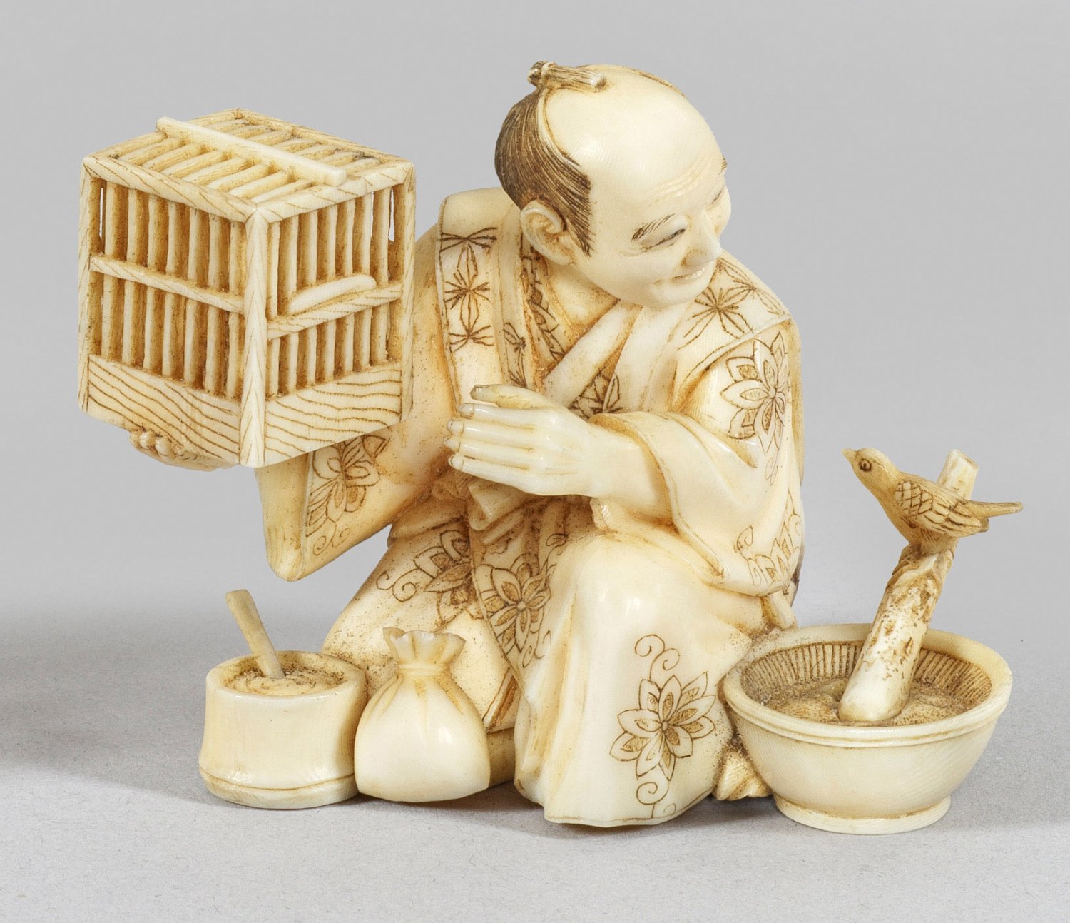 Elfenbein, geschnitzt, graviert und teilw. geschwärzt. Äußerst fein geschnittene, vollplastische und ausdrucksstarke Darstellung eines knienden Mannes mit einem Vogelkäfig. Neben ihm in einer Schale ein Vogel auf einem Stock sitzend. Bodenunterseite mit alten Etikettresten. H. 5,3 cm.
