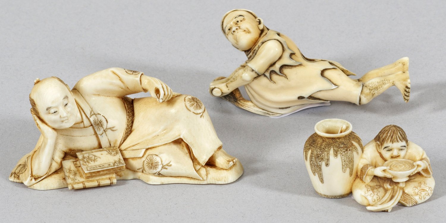 sog. Netsuke. Elfenbein, geschnitzt, graviert und teilw. geschwärzt. Fein geschnittene, vollplastische Darstellungen eines Mannes neben einer Vase sitzend und aus einer Schale trinkend sowie von zwei liegenden Männern. Teilw. sign. "Yoshimoto", "Akishige". H. 2 cm - 3 cm.