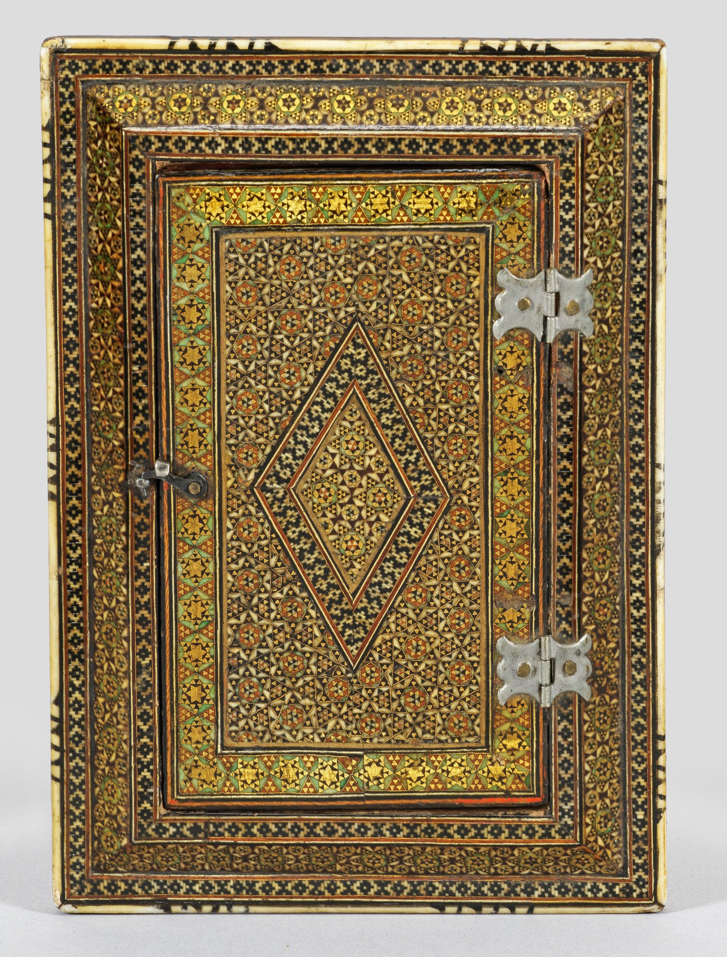 in sog. Khatam Kari-Technik. Holz und Knochen, lackiert. Flache, hochrechteckige Form. Scharnierter, mit Häkchen verschließbarer Deckel mit dahinter befindlichem Spiegel. Flächendeckende, filigrane Verzierung aus äußerst feinen, sternförmig und geometrisch angeordneten Einlegearbeiten aus farbig gefasstem Holz, Knochen und Goldfolie. Minim. Fehlstellen. 18 cm x 12,5 cm.