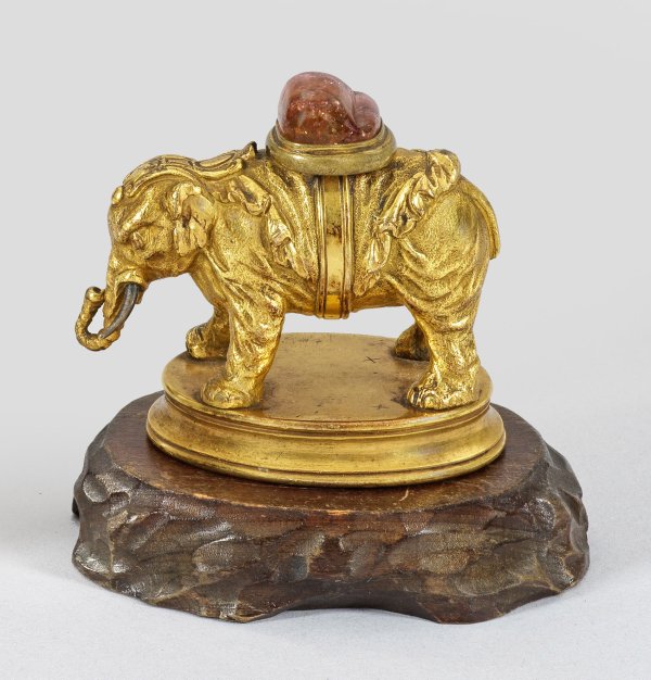 Bronze, teilw. feuervergoldet, auf Holzsockel. Über leicht eingezogener Bodenplatte ein naturalistisch gestalteter, indischer Elefant mit Decke, Kopfschmuck und Bauchgurt, der auf dem Rücken einen Amethyst trägt. Gesamt-H. 8 cm.