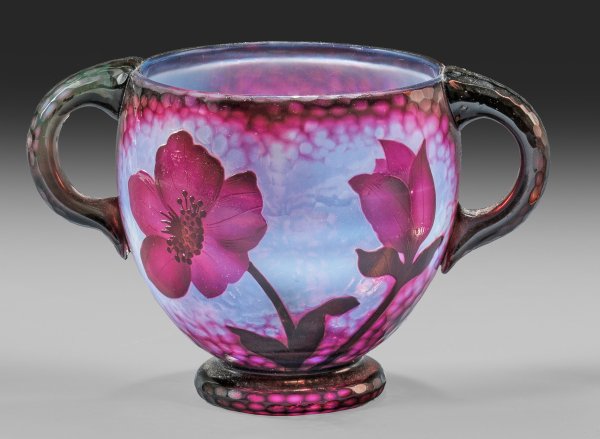 Ovoider, weiter Korpus mit zwei gegenständigen Ohrenhenkeln. Überfangglas, leicht opalisierend und dunkelbordeauxrot. Polierter, geätzter Dekor mit geschnittenem Martelé-Grund. Sign. "DAUM NANCY" mit Lothringer Kreuz. H. 10,5 cm.