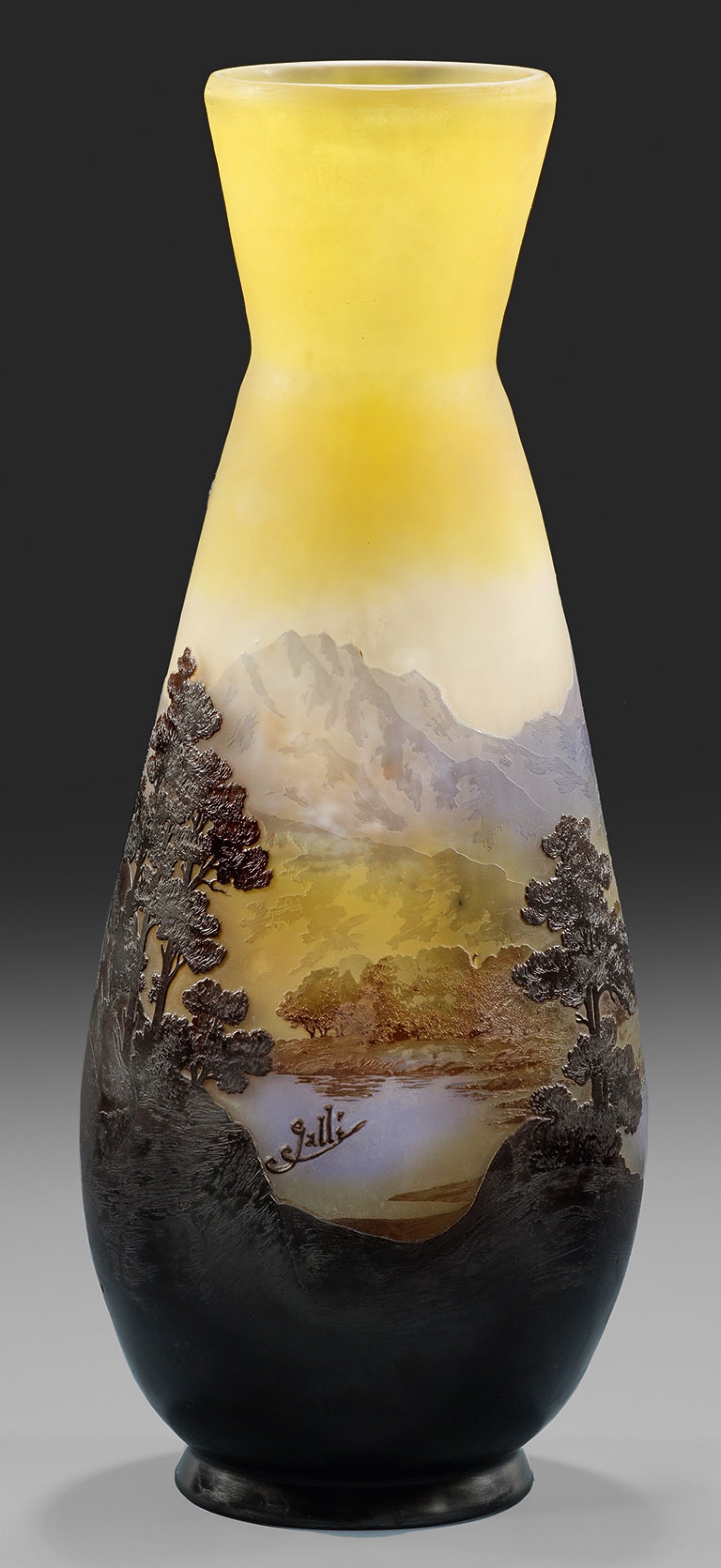 Leicht ins Oval gedrückte Kolbenform mit konischem Hals. Überfangglas, farblos, bernsteingelb, olivgrün, hellblau und violett. In mehreren Arbeitsgängen geätzter und polierter Dekor mit abendlich gestimmtem Landschaftsmotiv und Blick auf einen von Bäumen umstandenen See und Alpengipfel. Sign. "Gallé". H. 40 cm.