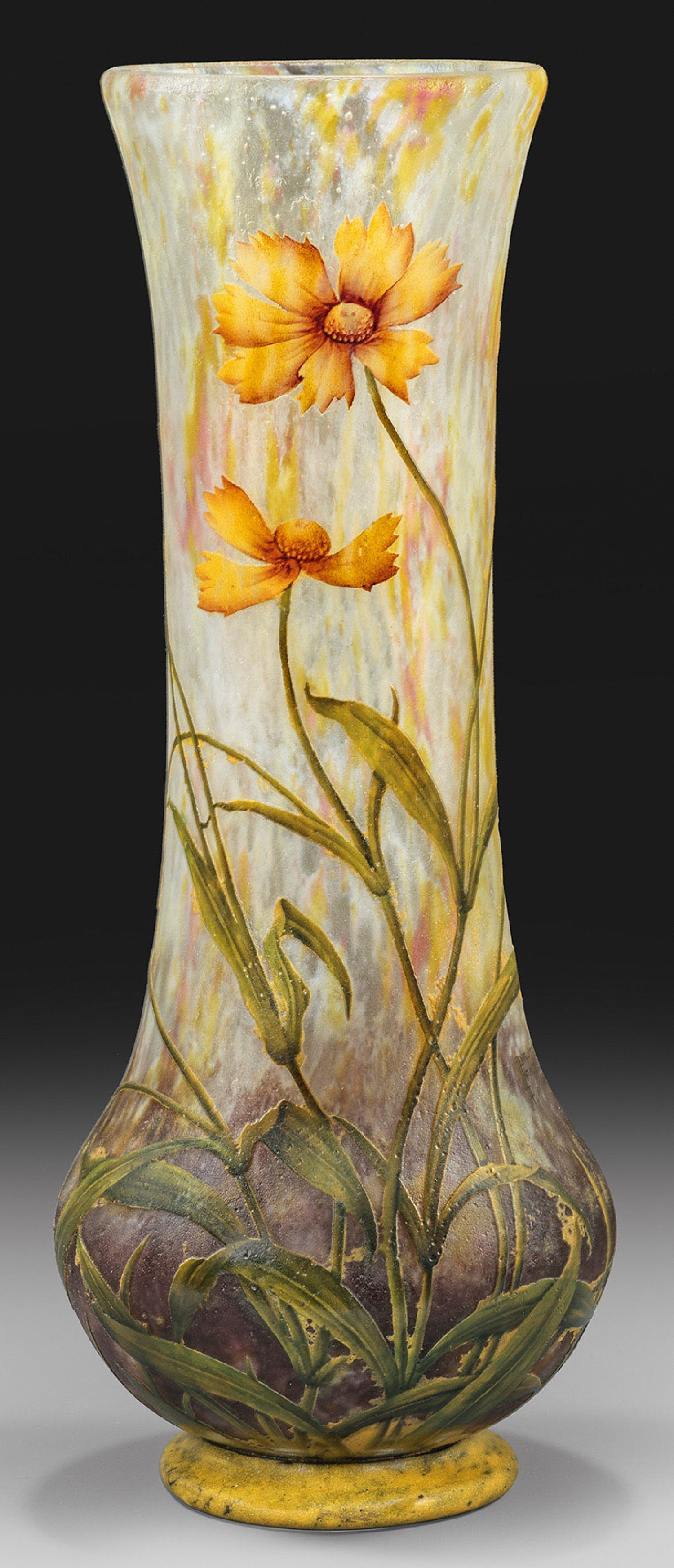 A very large French Art Nouveau glass vase with acid-etched and polychrome enamelled decor of Coreopsis by Daum Frères. Signed.