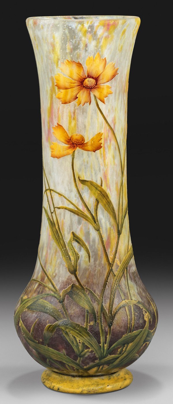 Balusterform. Überfangglas, farblos sowie mit weißen, gelben, grünen und violetten Pulvereinschmelzungen. In mehreren Arbeitsgängen geätzter Dekor kombiniert mit polychromer Emailmalerei aus blühenden Stängeln vom Mädchenauge (Coreopsis), auch Schöngesicht genannt. Sign. "DAUM NANCY" in Verbindung mit Lothringer Kreuz sowie "FRANCE". H. 45,7 cm.