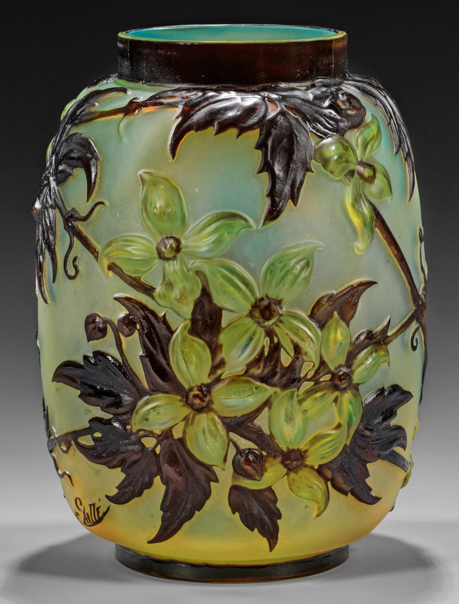 Gerundete Walzenform mit weitem, kurzem, hochgezogenem Hals. Überfangglas, farblos, bernsteinfarben, hellblau opalisierend und dunkelbraun (bzw. dunkelviolett). Reliefplastischer, in Soufflé-Technik ausgeführter, im Modell eingearbeiteter Dekor aus blühenden Clematisranken vor matt ausgeätzem Grund. Sign. "Gallé". H. 24 cm.