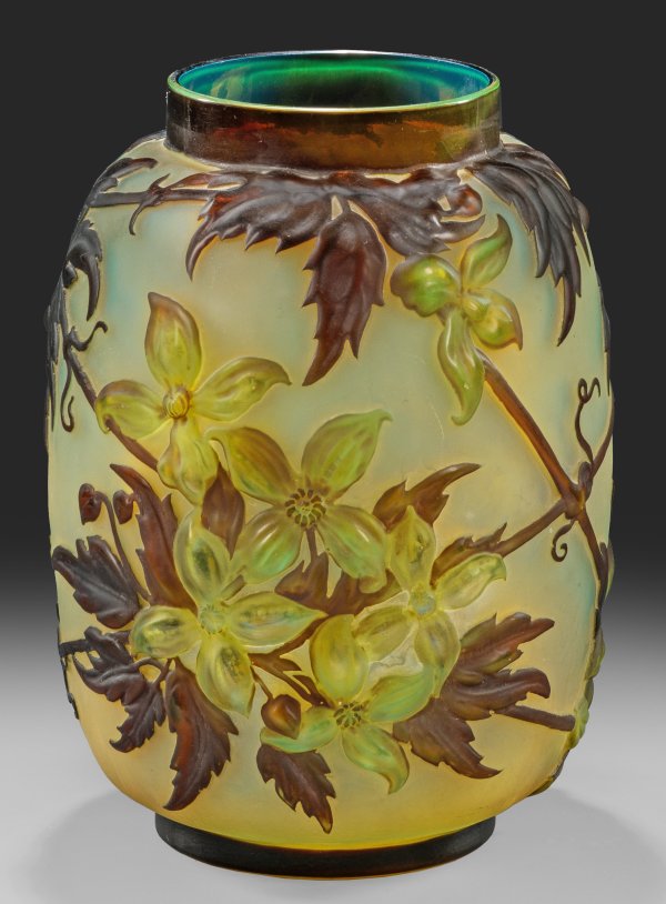 Gerundete Walzenform mit weitem, kurzem, hochgezogenem Hals. Überfangglas, farblos, bernsteinfarben, hellblau opalisierend und dunkelbraun (bzw. dunkelviolett). Reliefplastischer, in Soufflé-Technik ausgeführter, im Modell eingearbeiteter Dekor aus blühenden Clematisranken vor matt ausgeätztem Grund. Sign. "Gallé". H. 24 cm.