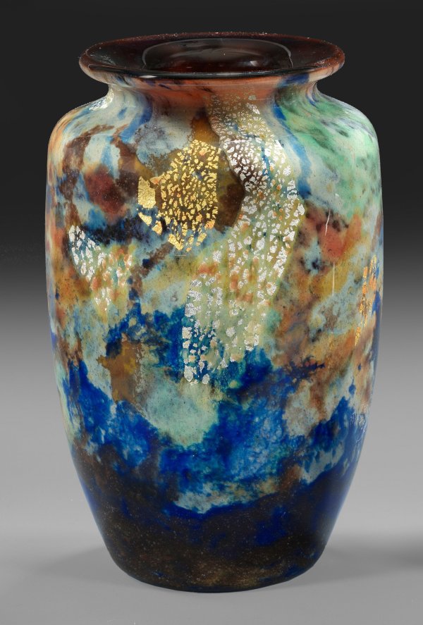 Gestreckt-ovide Form mit akzentuiertem Lippenrand. Überfangglas, farblos und rotbraun, in einer Zwischenschicht polychrome Pulvereinschmelzungen sowie Einschmelzungen aus zersprengter Gold- und Silberfolie. Sign. "MULLER FRES LUNEVILLE". H. 17 cm.