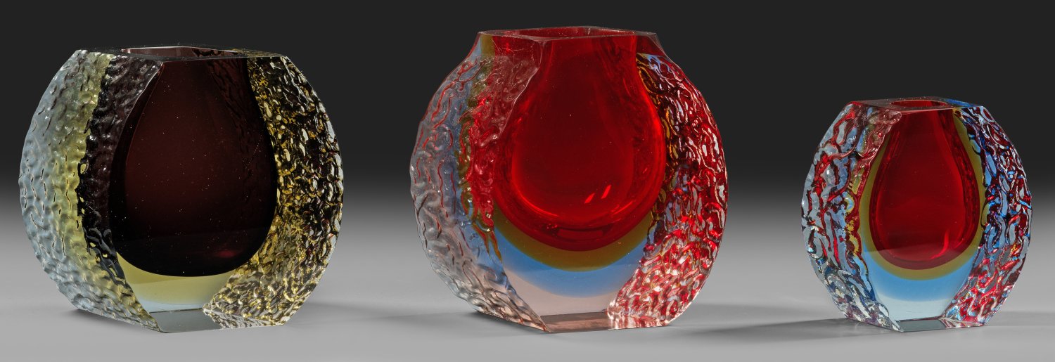 Diagonal zu einer Raute verschobene, beidseitig abgeplattete Block- bzw. Scheibenform. Dickwandiges Glas in "Sommerso"-Technik, farblos, gelb, rot und violett, die Schmalseiten mit stilisiertem, korallenartigem Relief, die Längsseiten mit Boden und Mündung geschliffen und poliert. H. 13,3 cm-17,3 cm.