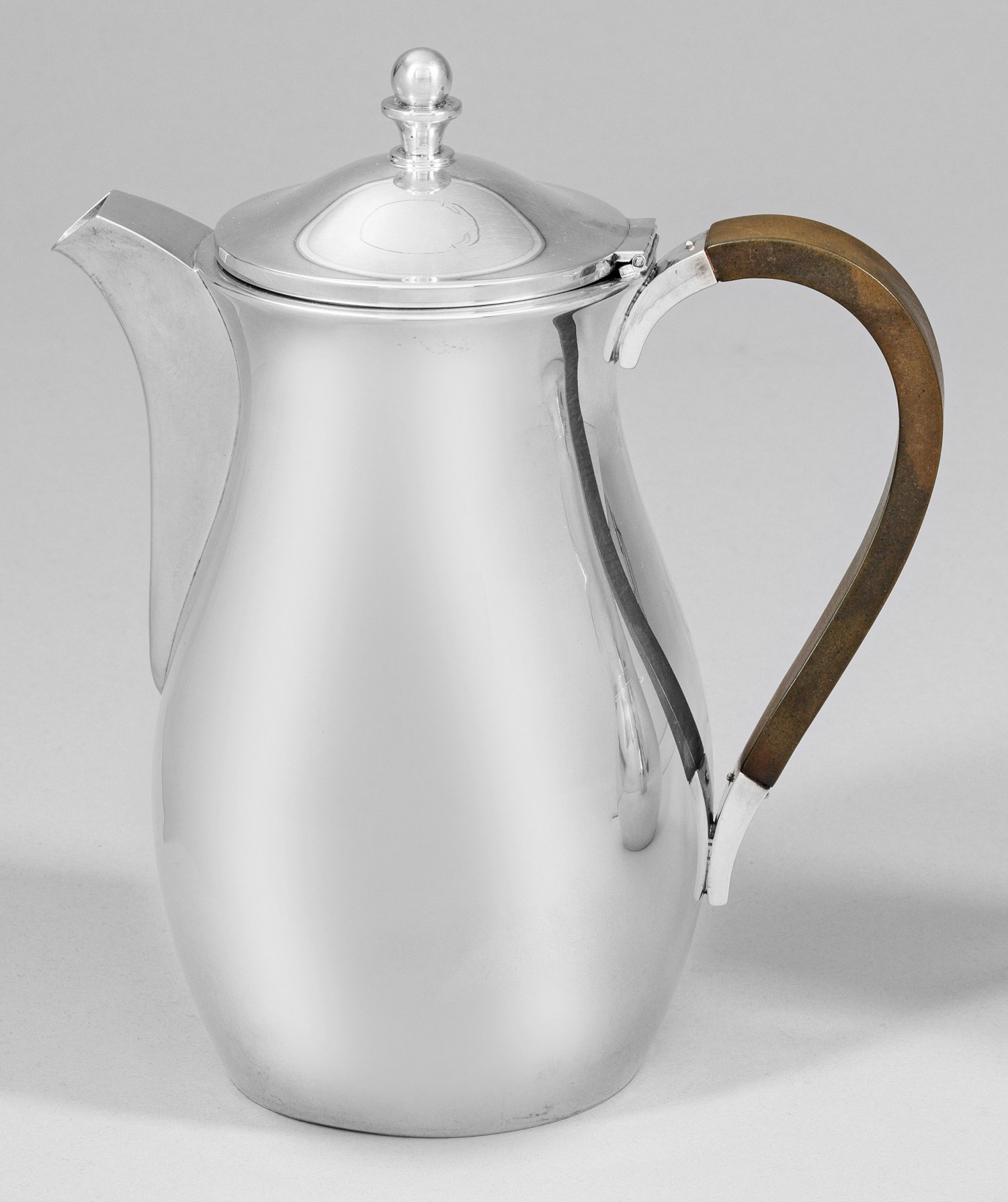 Silber. Flacher, runder Stand, übergehend in birnförmigen Korpus mit leicht aufgewölbtem Scharnierdeckel und umgekehrt glockenförmigem, von einer Kugel bekrönten Deckelknauf. Mittig angesetzter Konsolausguss. Gekanteter Ohrenhenkel aus braunem Bakelit. Gest., Beschaumeister Jens Sigsgaard, Hersteller Carl M. Cohr/Händler "Ernst". Gew. ca. 490 g. H. 24 cm.