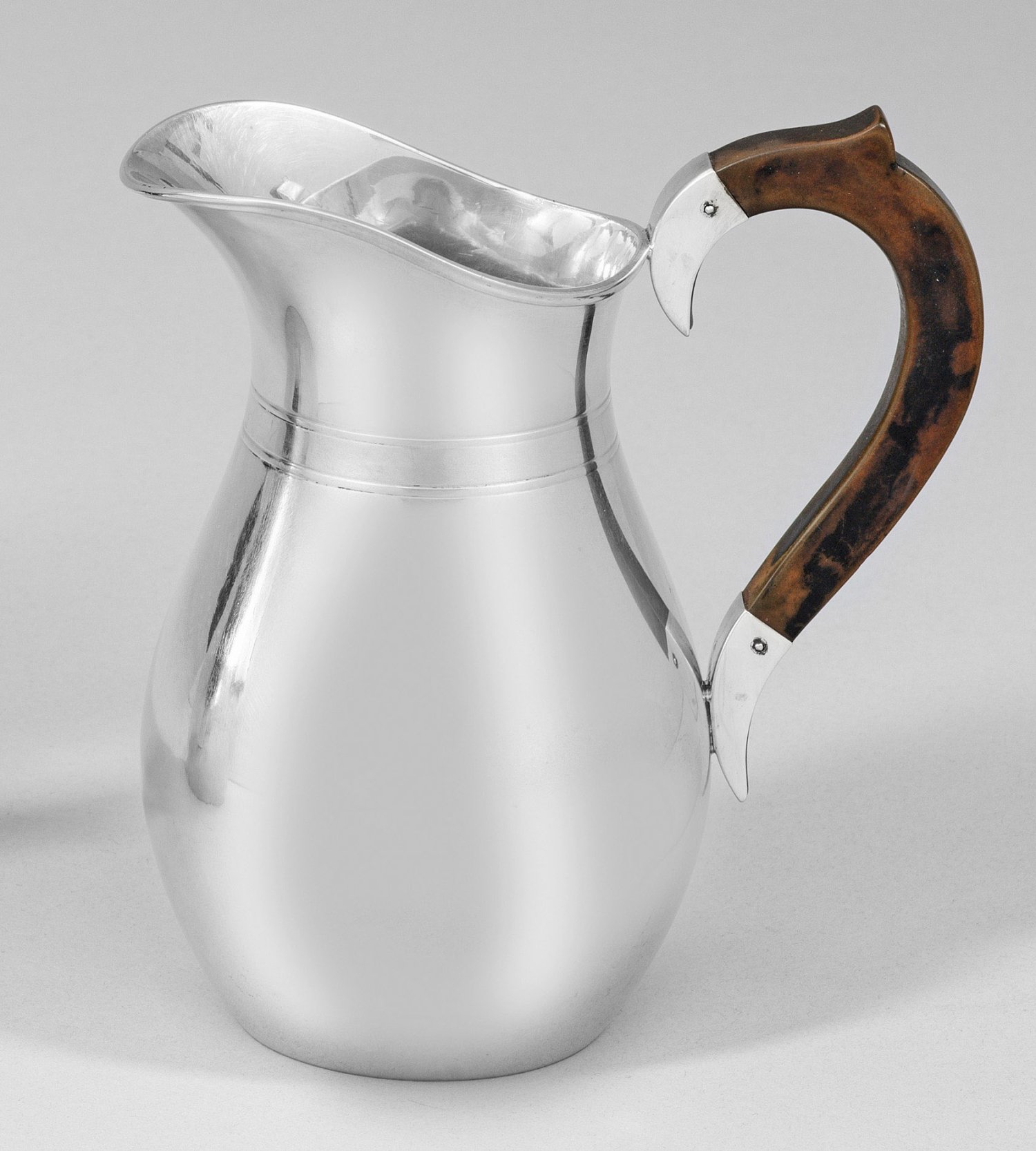 Silber. Über gebauchtem Korpus mit eingezogener, von zwei doppelten Zierlinien umzogene Schulter und gerundeter Ausguss mit profilierter Außenkante. Scharnierter Haubendeckel in Halbkugelform mit geschwungenem Band als Knauf. Ohrenhenkel aus ebonisiertem, gekantetem Holz. Gest., Stadtmarke, Beschaumeister Jens Sigsgaard, Herstellerzeichen sowie dat.; Gew. ca. 240 g. H. 16 cm.