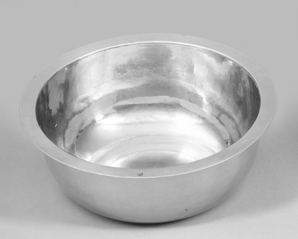 Sterlingsilber. Über gerundeter Wandung mit feinem Hammerschlagdekor abgesetzter, ausschwingender Rand. Gest. 925, Stadtmarke, Herstellerzeichen. Gew. ca. 540 g. H 8 cm, D. 22 cm.