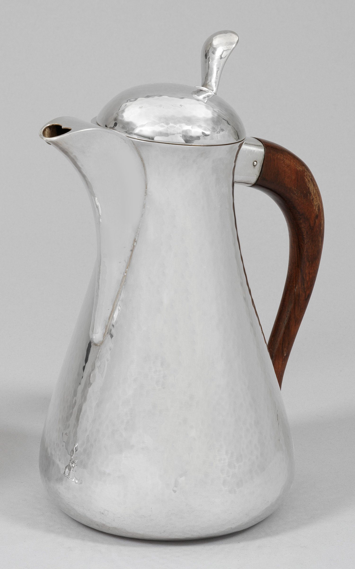 Sterlingsilber. Flacher, runder Stand, übergehend in gedrückt birnförmigen Korpus mit gerundetem, aufgewölbtem Scharnierdeckel und aufgestelltem Drücker. Die Wandung flächendeckend mit feinem Hammerschlagdekor verziert. Mittig angesetzter Konsolausguss mit herzförmiger Tülle. Gebogter, konischer Holzgriff. Gest. 925, Herstellerzeichen. Gew. ca. 965 g. H. 27,5 cm.