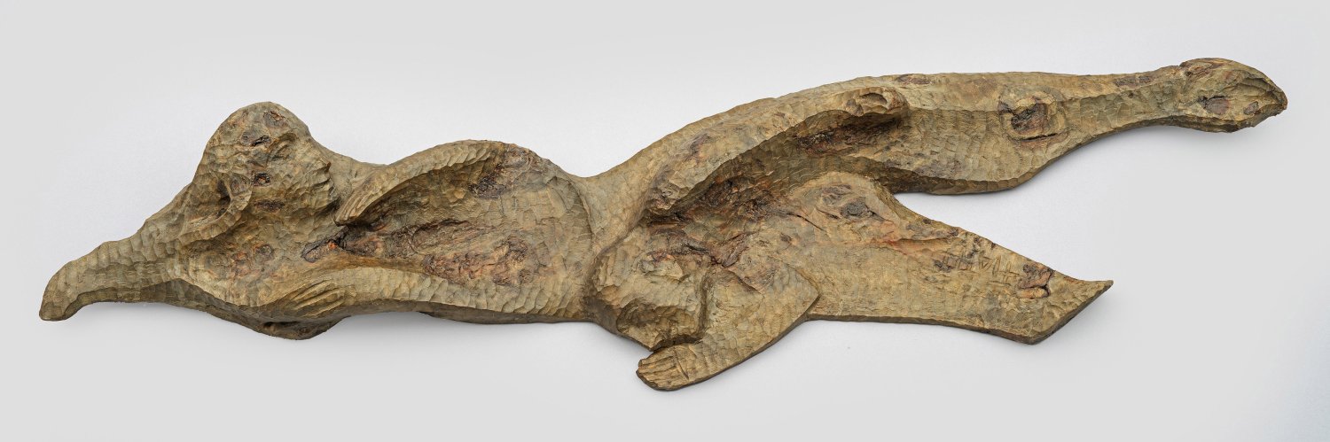 Lindenholz, geschnitzt, sichtbar belassene Bearbeitungsspuren, braun gebeizt. Sign.; Flath, der wesentlich durch Ernst Barlach beeinflusst wurde, studierte seit 1928 in der Holzbildhauerklasse der Kunst- und Gewerbeschule Kiel bei den Professoren Schnoor und Blatzek. 1936 ließ er sich als freischaffender Künstler, Holzbildhauer und Maler in Bad Segeberg nieder. H. 111,5 cm.