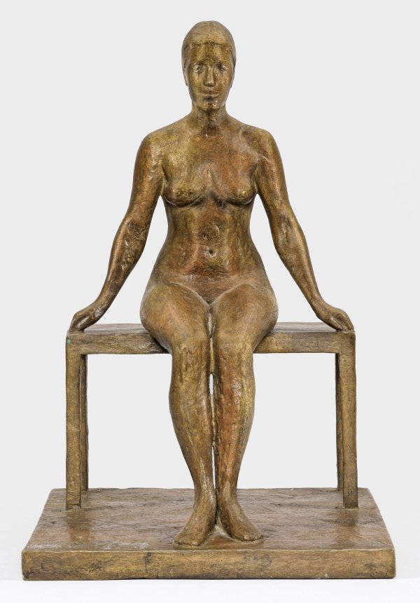 Bronze, braun patiniert. Gießerstempel "GUSS BARTH RINTELN". Mit dem Thema eines auf einer Bank sitzenden, meist weiblichen Aktes in ruhiger Pose, hat sich Kütemeier in einer großen Werkreihe von ästhetisch vollendeten Bronzeplastiken und Steinskulpturen befasst. Kütemeier, der bei Gustav Seitz an der Hochschule für bildende Künste in Hamburg studierte, verband hierbei die ägyptische und archaisch-griechische Bildhauerkunst mit der Moderne. H. 35,2 cm.