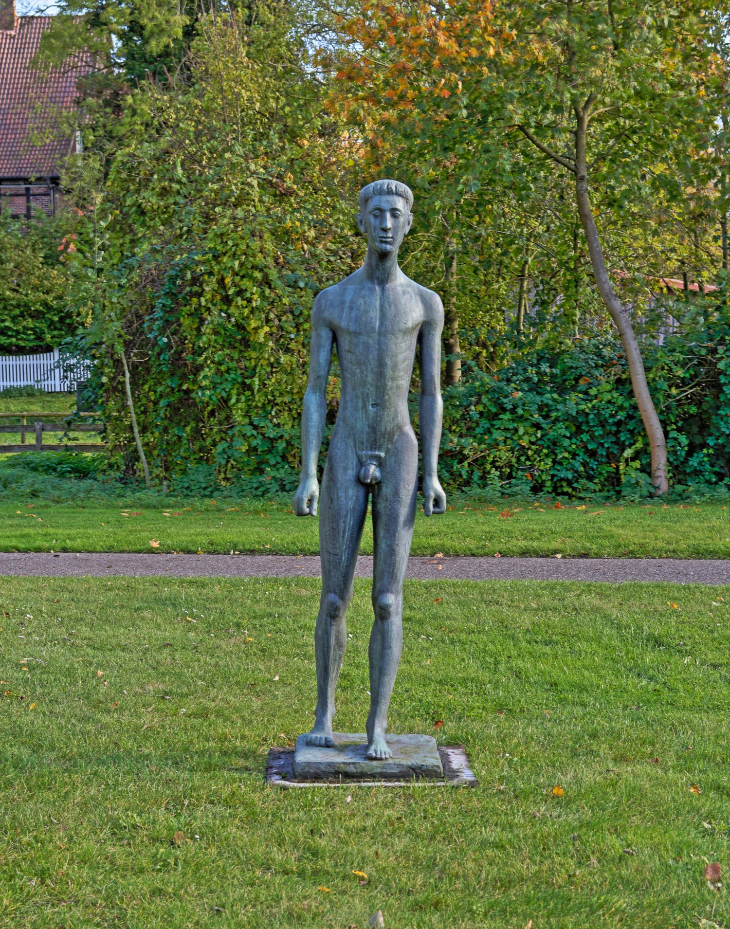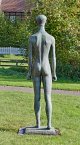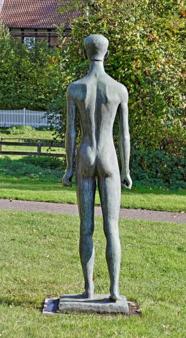 Bronze, patiniert, 1960. Sign. ("Phönix"-Künstlersignet). Guss Barth, Berlin. Wvz. Rudloff 735. Eins von drei bekannten Exemplaren, Rudloff führt nur diesen vorliegenden "Guß I Kunsthandel" auf; zwei weitere Güsse befinden sich im Germanischen Nationalmuseum in Nürnberg (Inv.-Nr. Pl.O. 3122) und im Skulpturengarten der Bürgerschaft in Bremen. Marcks wurde in seinem Schaffen maßgeblich von der Archaik (ca. 700 bis 500 v. Chr.) beeinflusst. Auch in der überlebensgroßen, 201 cm hohen Plastik "Schreitender Jüngling", knüpfte Marcks bewusst an die antiken Kuroi der archaischen Plastik Griechenlands an - Aktstatuen junger Männer als erste griechische Großskulpturen. Seit seiner ersten Reise nach Griechenland im Jahr 1928, die ihn über München führte, bezeichnete er sich als "unbedingten Griechenlandverehrer". Auf dieser Reise studierte er außer den Kuroi im Nationalmuseum von Athen auch die zwei bekannten Exemplare der Münchener Glyptothek. Deren formal straff stilisierte Gestalten entsprachen mit ihrem strengen Aufbau bei ihrer ganz leichten Schrittstellung auch seinen eigenen Vorstellungen von der Tektonik einer Figur. Schon 1943 hatte Marcks die durch die Kuroi inspirierte Bronzestatue "Ver Sacrum" geschaffen (Wvz. Rudloff 427). Aufgefrischt wurden die Eindrücke von 1928 durch eine vierwöchige Griechenland-Reise im Herbst 1959, im Folgejahr 1960 setzte er nun auch das überlebensgroße Format der Kuroi im "Schreitenden Jüngling" um. Marcks gehört zu den bedeutendsten figürlich arbeitenden deutschen Bildhauern der Moderne. Seine auf das Wesentliche in Form und Ausdruck komprimierten Darstellungen zeigen die Menschen nie heroisch oder pathetisch, sie spiegeln stattdessen in überzeitlicher Weise allgemeine Grundstimmungen, zuweilen auch eine gewisse Verhaltenheit wider. 1919-1924/25 wirkte Marcks als Bauhaus-Meister und leitete die Bauhaus-Töpferei in Dornburg/Saale; 1925-1933 lehrte und arbeitete er an der Kunstschule Burg Giebichenstein in Halle/Saale. Im "Dritten Reich" gehörte Marcks zu den von den Nationalsozialisten überwiegend kritisch gesehenen Künstlern, 1937 wurden 86 Werke beschlagnahmt und zum Teil in der Ausstellung "Entartete Kunst" diffamiert. 1945 berief man Marcks an die Landeskunstschule Hamburg, seit 1950 arbeitete er freischaffend in Köln, 1955 wurde er Mitglied der Berliner Akademie der Künste. 1971 eröffnete das Gerhard-Marcks-Haus in Bremen. H. 201 cm.