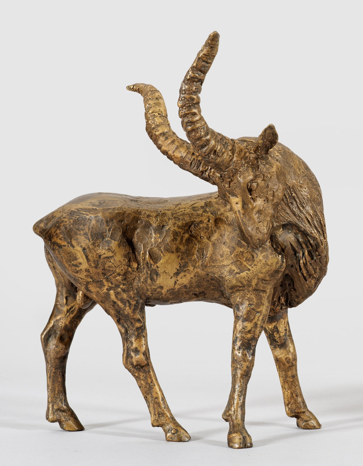 Bronze, goldbraun patiniert. Sign.-Stempel, nummeriert 1/12. Vollplastische, in moderner Weise stilisierte Darstellung eines stehenden Steinbocks mit nach hinten gewendetem Kopf. Schaffensschwerpunkte des international bekannten Bildhauers waren Porträts und Tierplastiken, die er seit 1980 vielfach ausstellte, u.a. 1984/85 in der großen Arentz-Einzelausstellung "Welt der Tiere" im Museum Koenig in Bonn. H. 29 cm.