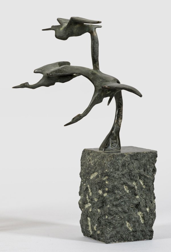 Bronze, dunkel patiniert. Monogr. "OH" bzw. "HO". In moderner Weise stilisierte, auf das Wesentliche der Vögel reduzierte Darstellung dreier fliegender Reiher. Anthrazitfarbener, quaderförmiger, roh belassener, nur an der Oberseite polierter Steinsockel, wohl Diabas. Unterhalb Widmungsplakette von 1969 mit Inschrift "Herrn Bundeskanzler Dr. h. c. Kurt Georg Kiesinger zum 65. Geburtstag (/) Deutscher Gewerkschaftsbund Bundesvorstand". Ges.-H. 32,7 cm.