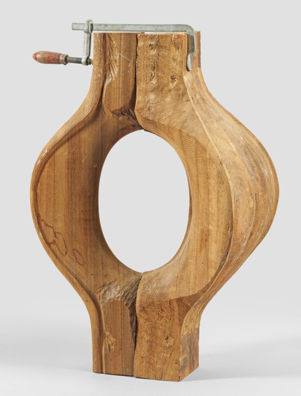 3-tlg.; Teakholz und kleine Zwinge. Leicht asymmetrische Skulptur aus zwei gebauchten Holzelementen mit vertikal verlaufenden Kerben und betonten, konvex reliefierten Seitenkanten; die durch die Zwinge zu einer organischen Form mit ovalem Durchbruch zusammengepresst werden. Raidt studierte an der Staatl. Akademie der Bildenden Künste in Stuttgart; danach lebte und arbeitete er ebenda sowie in verschiedenen Städten, vorwiegend in Baden-Württemberg. Ca. 68 cm x 46 cm x 32,5 cm.