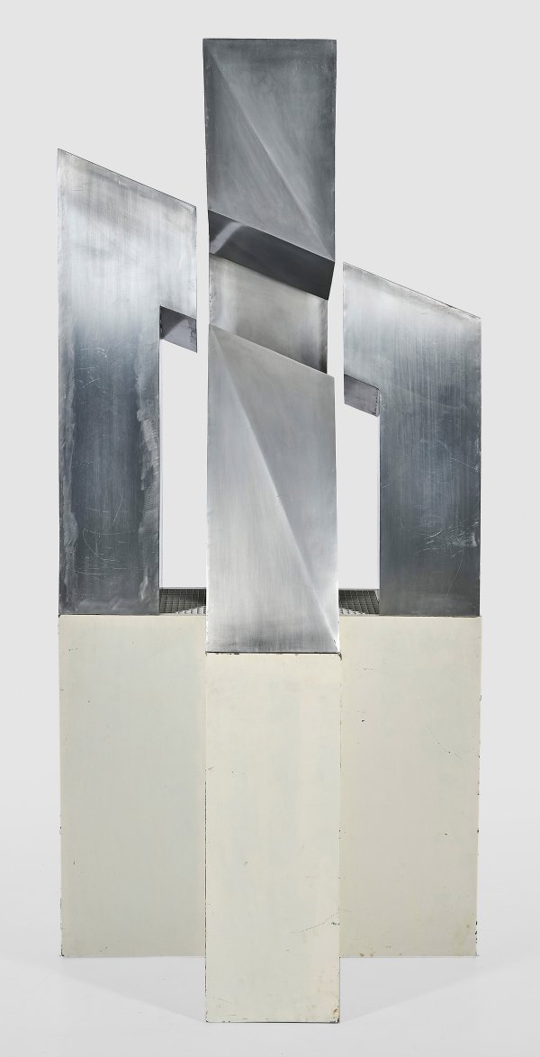 4-tlg.; Aluminium, teilw. gebürstet; weiß lackiertes Holz. Kreuzförmige Sockelpartie mit zwei eingelassenen, rechteckigen Aluminiumgittern; darauf drei lose unterschiedliche, stereometrische, einzelne Winkelelemente mit einem größeren Mittelteil, die durch ihre Zusammenstellung eine Diagonal- bzw. Kreuzform bilden. Zum wesentlichen Ausdrucksträger außer der Skulptur selbst werden das sich auf dem glänzenden Metall reflektierende Licht und der sich dynamisch im Raum bewegende Betrachter im Sinne der Kinetischen Kunst. Raidt studierte an der Staatl. Akademie der Bildenden Künste in Stuttgart; danach lebte und arbeitete er ebenda sowie in verschiedenen Städten, vorwiegend in Baden-Württemberg. Ges.-H. ca. 180 cm; Sockel ca. 85 cm x 74 cm.