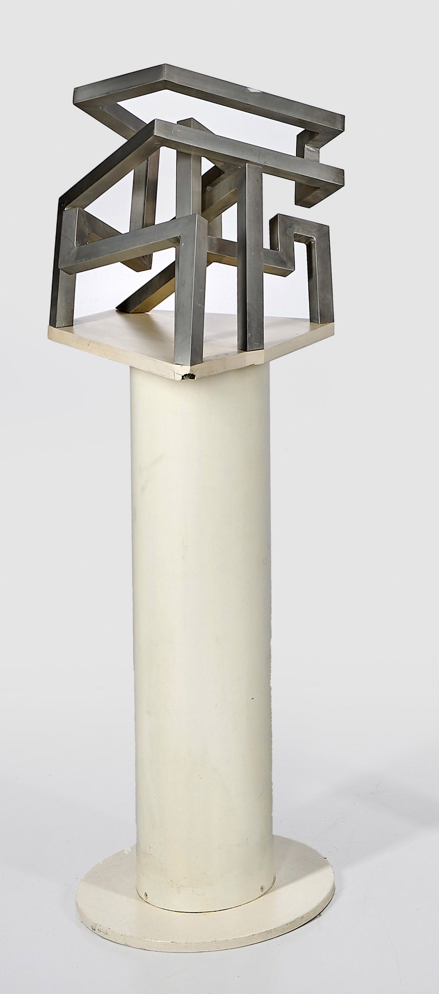Aluminium, teilw. gebürstet; weiß lackiertes Holz bzw. Spanplatte. Auf einem runden Pfeilersockel mit flacher, asymmetrischer Deckplatte komponierte Skulptur aus drei einzeln montierten, unterschiedlichen Winkelelementen, die zusammen eine komplexe Raumskulptur ergeben. Zum wesentlichen Ausdrucksträger außer der Skulptur selbst werden das sich auf dem glänzenden Metall reflektierende Licht und der sich dynamisch im Raum bewegende Betrachter im Sinne der Kinetischen Kunst. Raidt studierte an der Staatl. Akademie der Bildenden Künste in Stuttgart; danach lebte und arbeitete er ebenda sowie in verschiedenen Städten, vorwiegend in Baden-Württemberg. Ges.-H. ca. 135 cm.