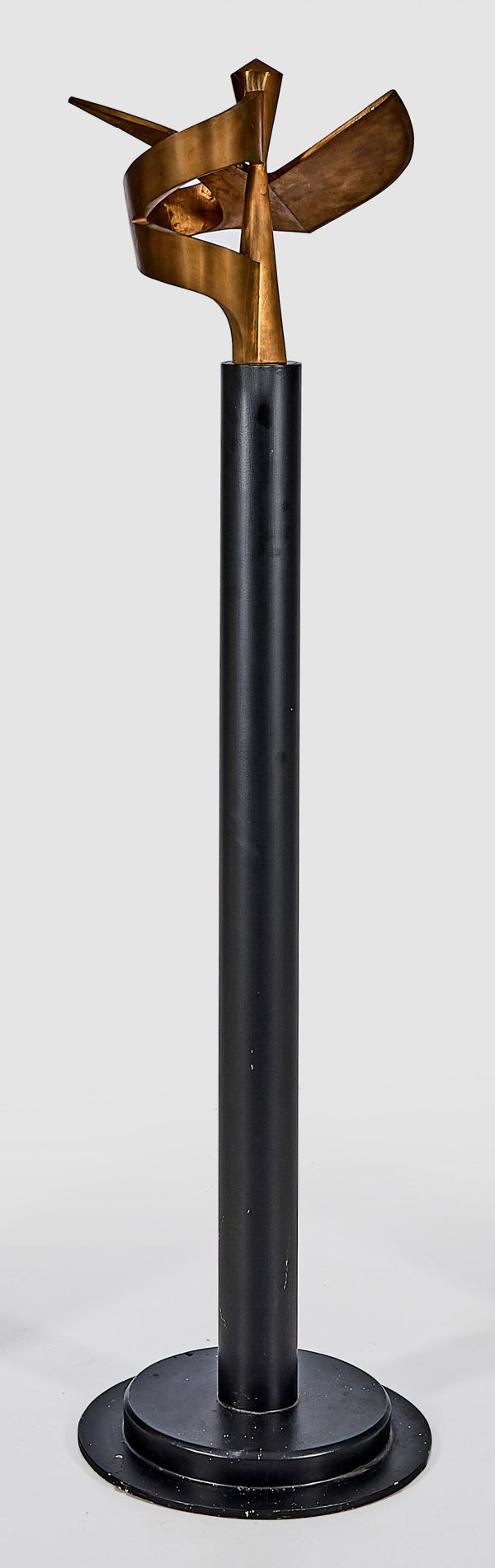 Bronze, gegossen, teilw. gebürstet; Stele aus schwarz lackiertem Metallrohr mit abgetrepptem Holz-Fuß. Die dynamisch gestaltete Plastik steht in der Tradition des Kubismus und der Kinetischen Kunst, wobei sie eine geschwungene Schraubenform mit einem Kegel verbindet, sodass sie Assoziationen an eine menschliche Figur, einen Engel oder Vogel hervorruft. Raidt studierte an der Staatl. Akademie der Bildenden Künste in Stuttgart; danach lebte und arbeitete er ebenda sowie in verschiedenen Städten, vorwiegend in Baden-Württemberg. Ges.-H. ca. 154,5 cm.