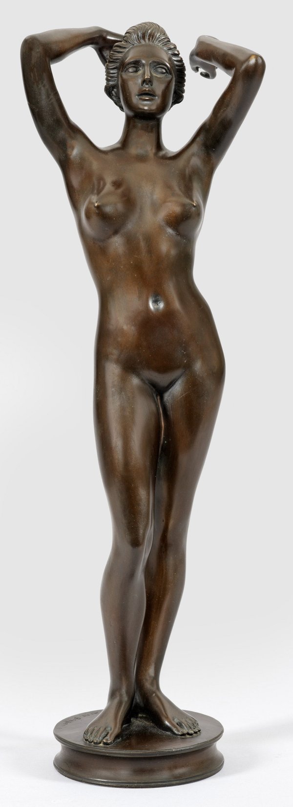 Bronze, dunkelbraun patiniert. 1981. Sign. u. nummeriert 39/99; Guss Venturi Arte, Bologna (mit Gießerstempel "VENTURI ARTE). Auf einer runden Plinthe im Kontrapost stehender weiblicher Akt mit hinter den Kopf erhobenen Händen. Bronze-Statuette aus dem reifen Spätwerk Brekers. H. 58,5 cm.