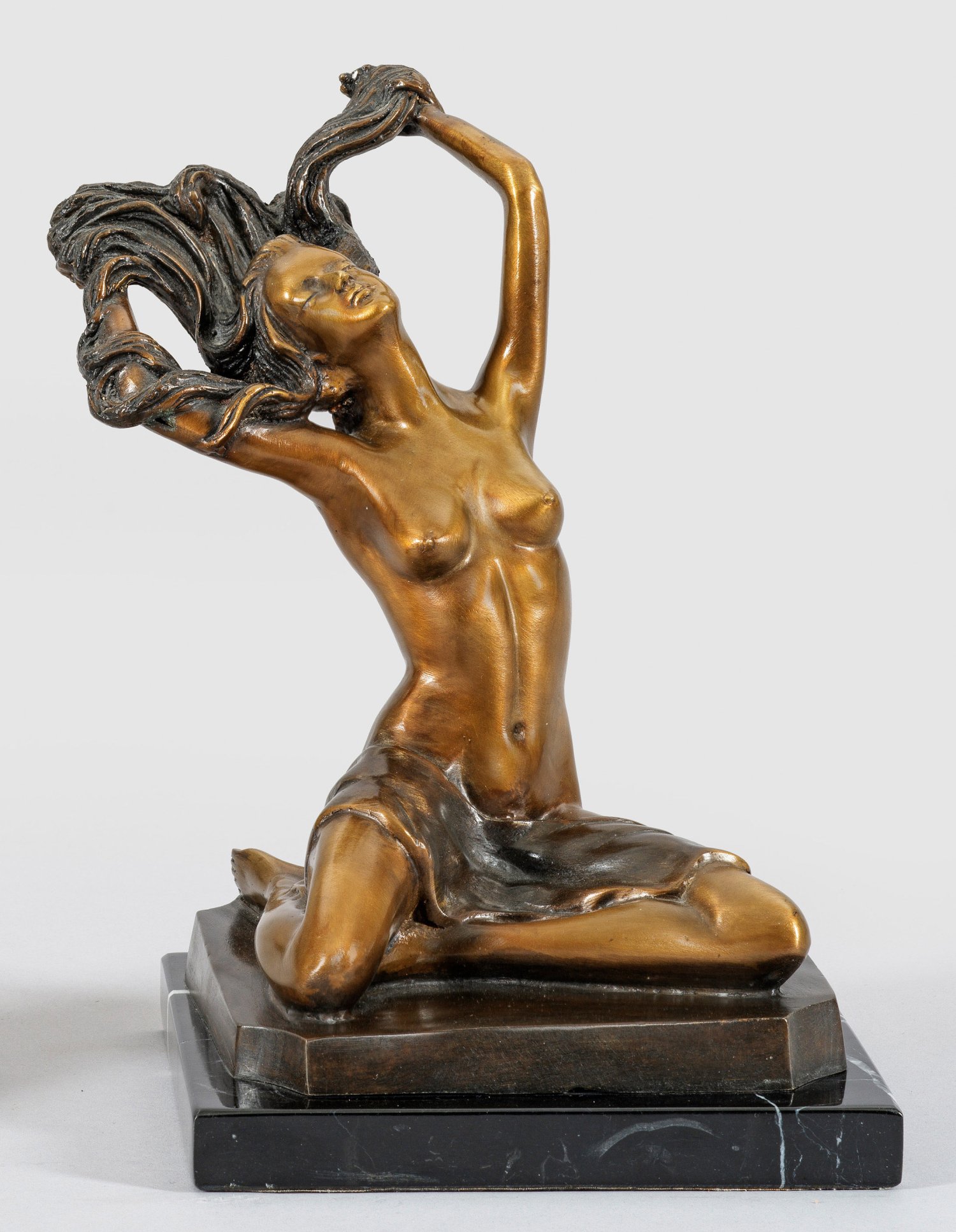 Bronze, gold- und dunkelbraun patiniert. Bez. "JA. HOUDON". Schwarzer, weiß geäderter Marmorsockel. Auf einer rechteckigen Plinthe sitzende junge Frau in lasziver erotischer Pose. Ges.-H. 28,5 cm.
