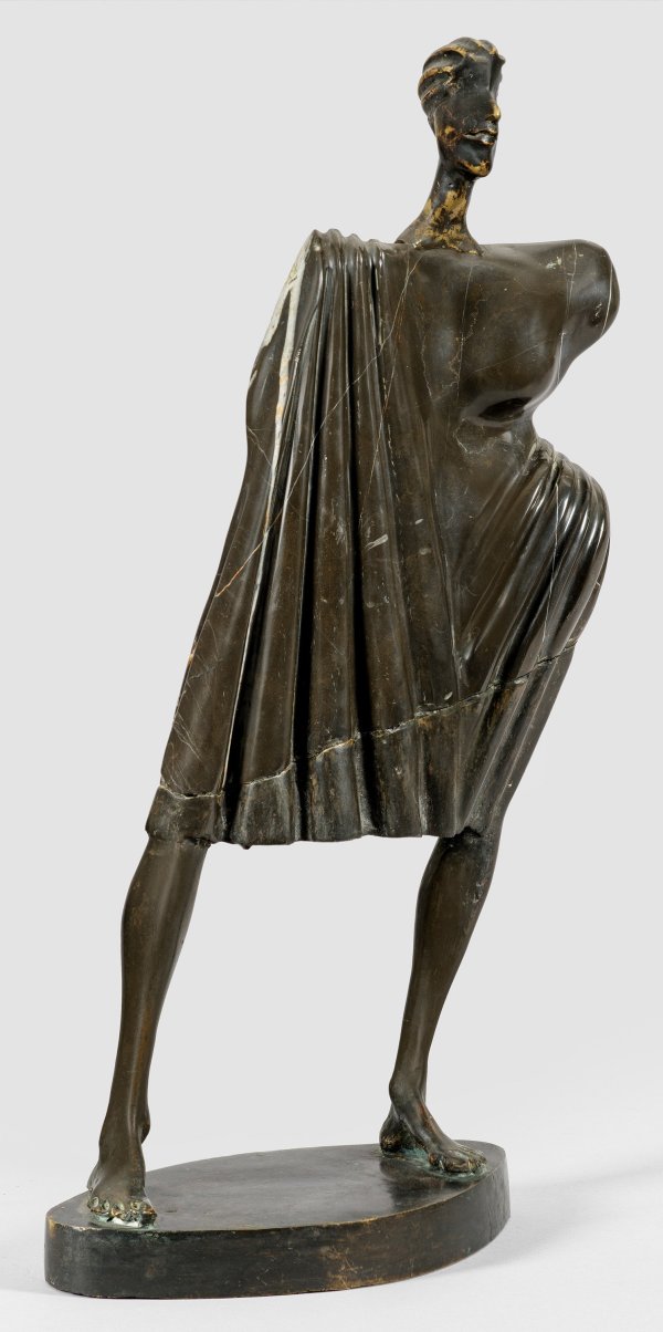 Bronze, dunkel patiniert u. schwarzer Marmor. Auf der Unterseite sign. u. dat. (19)90. Auf einer querovalen Plinthe stehender, stilisierter, zur Seite geneigter Halbakt mit abgeplattetem, überdimensional breitem Oberkörper. Die Bildhauerin studierte 1971-1977 an der Akademie der Bildenden Künste in Sofia, hatte seitdem mehr als 20 Einzelausstellungen und 100 Gruppenausstellungen, nahm an über 35 internationalen Bildhauer-Symposien teil, wobei sie eine Reihe von Auszeichnungen erhielt. Ihre Arbeiten befinden sich u. a. in der Nationalgalerie in Sofia. H. 60,5 cm