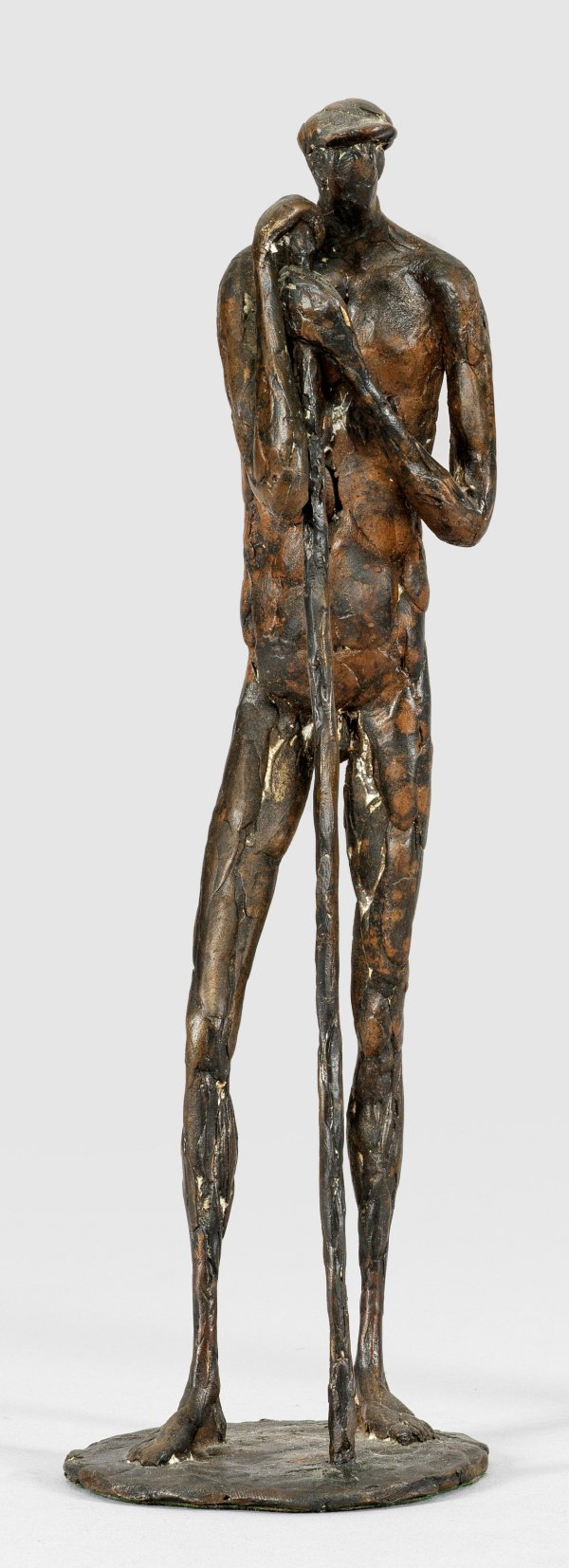 Bronze, dunkel patiniert, 1984. Monogr. u. dat.; Auf einer runden Plinthe stehende, expressiv in den Proportionen überlängte Figur mit Schiebermütze, sich in leicht geneigter Pose mit beiden Händen auf den langen Stab stützend. H. 27 cm.