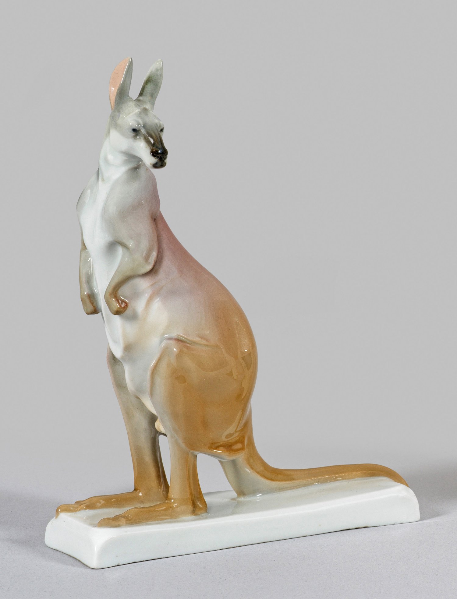 Auf schmalem Rechtecksockel aufrechtstehendes, den Kopf seitlich geneigtes Känguru. Naturalistische polychrome Unterglasurmalerei. Entw. Max Bochmann, 1905. Modell-Nr. Y 105. Unw. rest.; Schwertermarke. H. 16 cm.