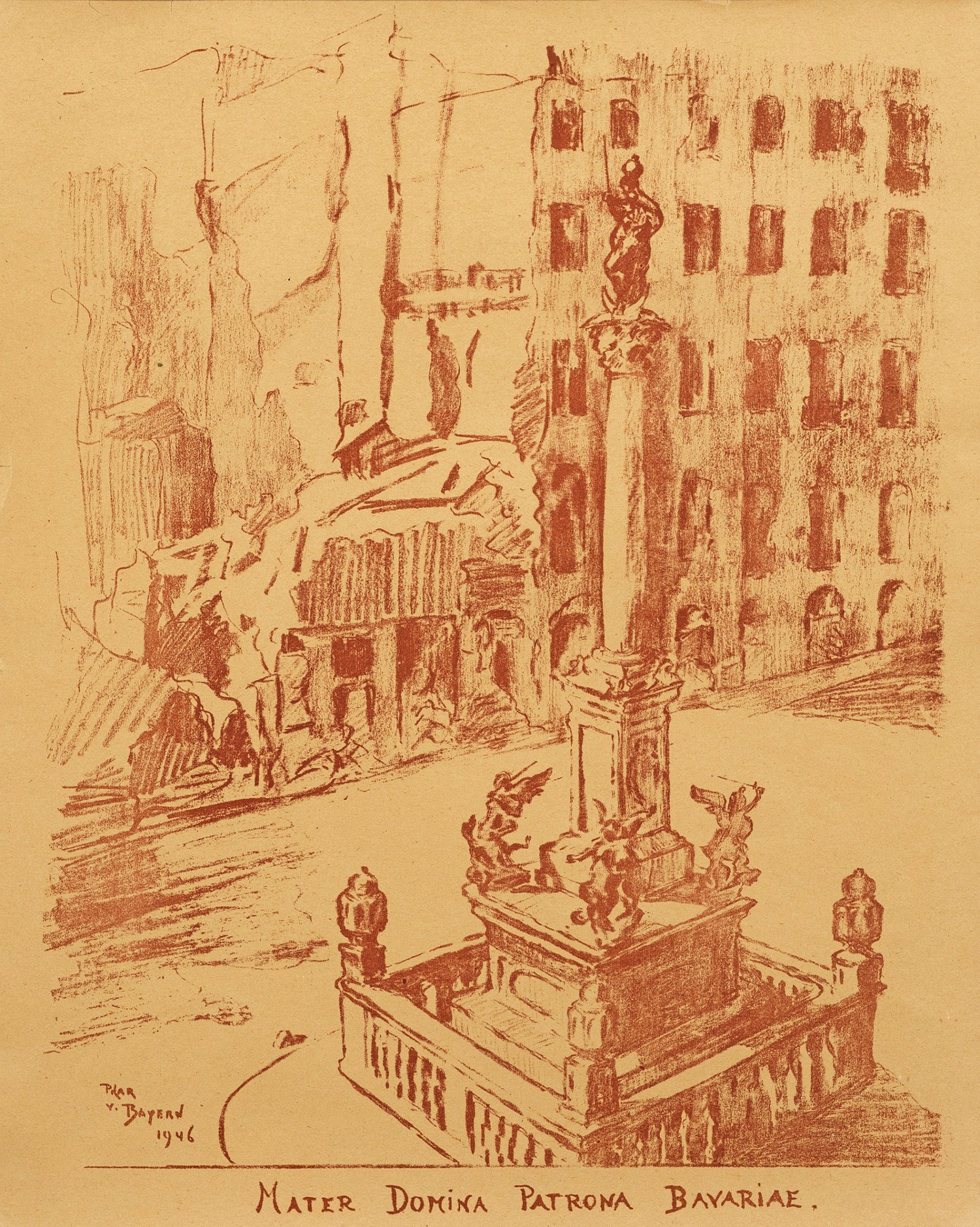 Lithographie in Rostrot/chamoisfarbenes Papier, 1946. Im Stein sign., dat. und betitelt. Darstellung der Mariensäule auf dem Münchener Marienplatz, die die Gottesmutter als "Patrona Bavariae" und somit als Schutzheilige Bayerns - begleitet von vier Heldenputten - schildert. Blatt 45,4 cm x 36,8 cm. Rahmen.