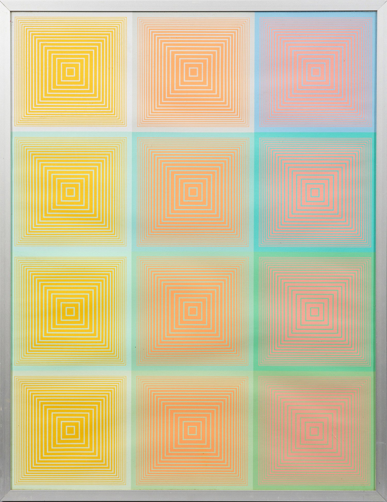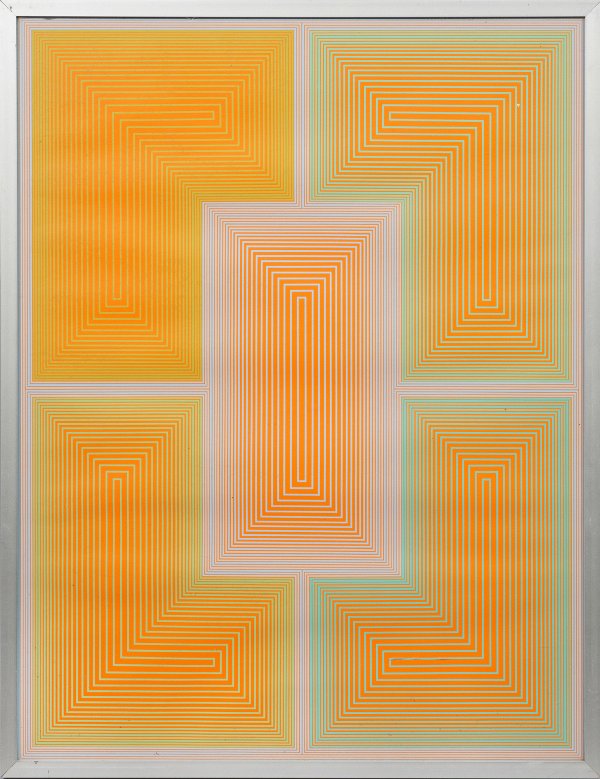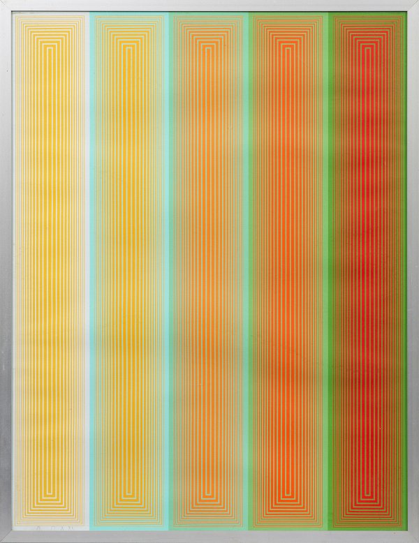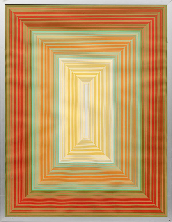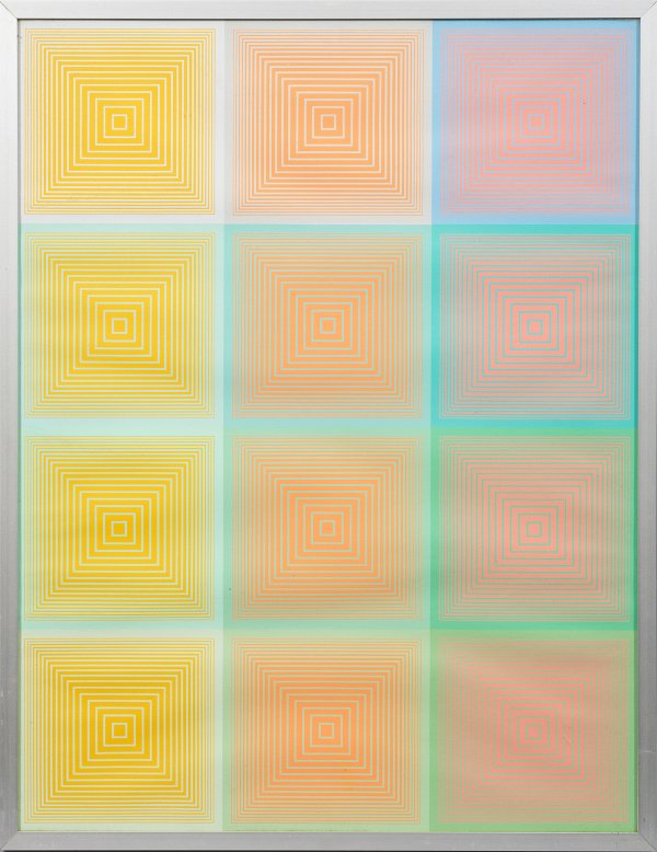 Farbsergraphien/Velin, 1970. Hrsg. Edition Domberger, Stuttgart in einer Auflage von 500 unsignierten u. unnummerierten Exemplaren. Der amerikanische Op-Art-Pionier studierte beim Bauhaus-Meister Josef Albers, seit 1960 stellte er vielfach aus, u.a. im MoMA in New York, bei der Biennnale in New York und auf der documenta in Kassel. Blatt ca. 65,5 cm x 50,5 cm.