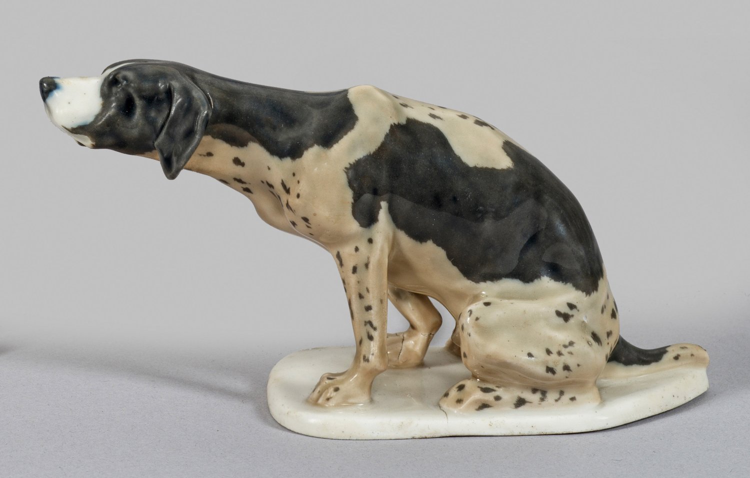 Auf flachem, unregelmäßig ovalem Sockel sitzender Jagdhund. Naturalistische polychrome Malerei. Entw. Paul Walther, 1908. Modell-Nr. Y 120. Entw.-Monogr.; Herstellungsbed. Spannungsrisse. Schwertermarke. H. 8 cm. B. 15 cm.