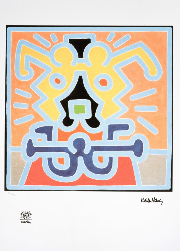 Farboffsetlithographie/Bütten. Im Druck sign. u. von fremder Hand nummeriert 58/150. Emblem/Signet und Blindstempel der Keith Haring Foundation. Nach einem Gemälde Harings aus dem Jahr 1988. Darstellung 46 cm x 46,4 cm. Blatt ca. 70,2 cm x 50,2 cm.