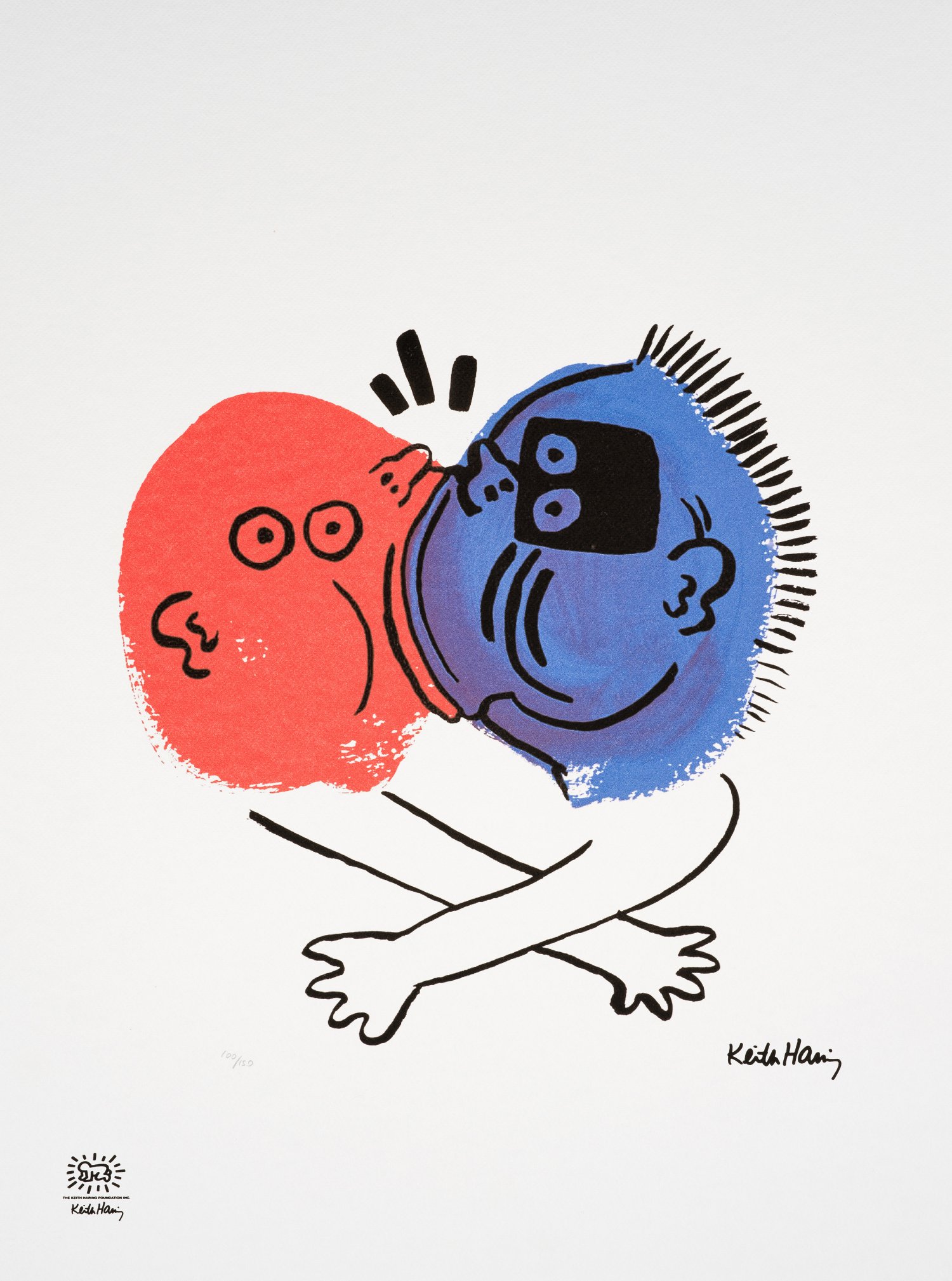 After Keith Haring (1958 - 1990). Offset lithograph in colours on laid paper. Printed signature. Numbered 100/150. With blind stamp and emblem of the Keith Haring Foundation. Subsequent reprint of the series "The Story of Red + Blue".