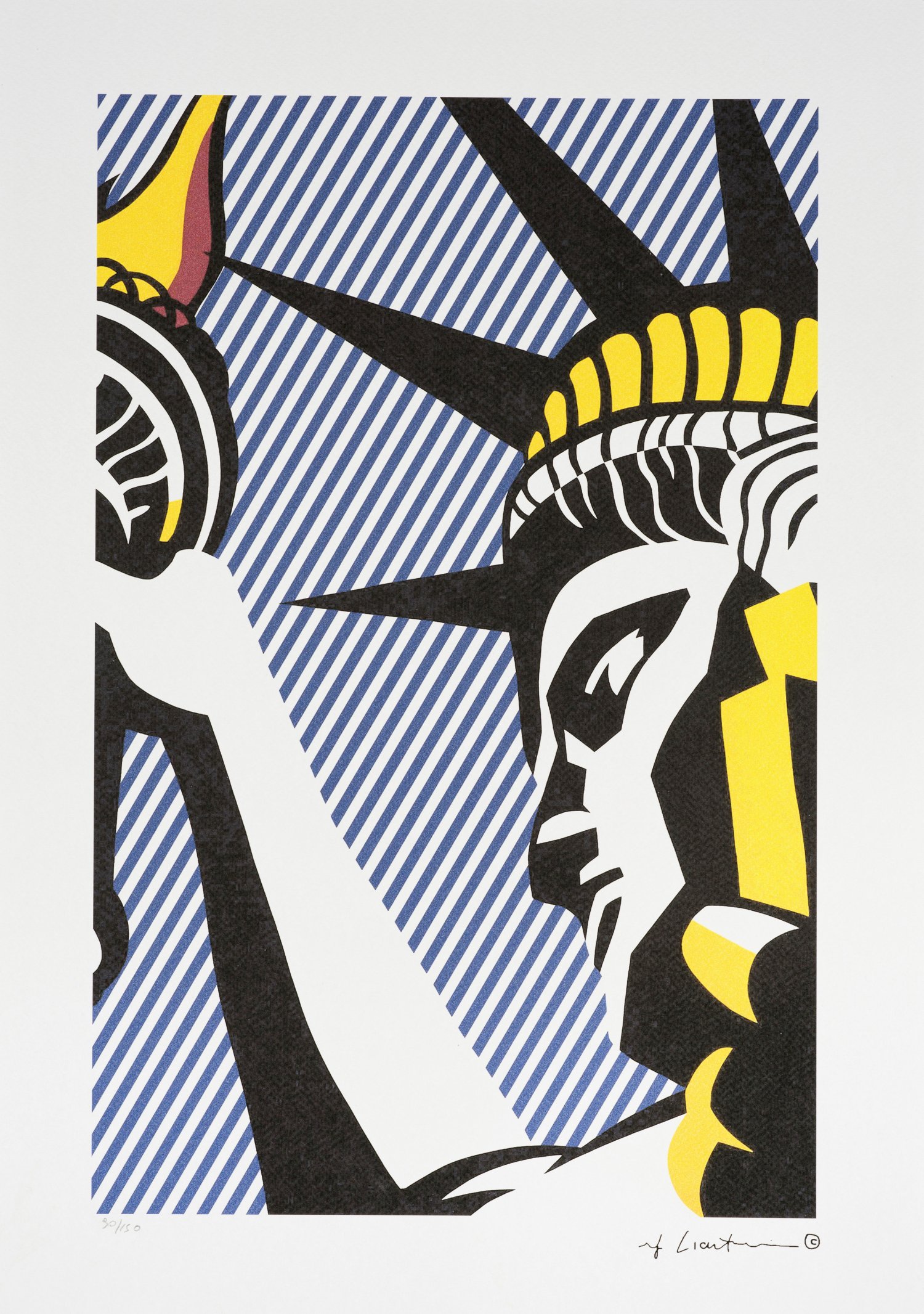 Farboffsetlithographie/Bütten. Im Stein sign. mit Copyrightemblem sowie von fremder Hand nummeriert 90/150. Hrsg. Castelli Graphics (rücks. Stempel in Rot), New York, gedruckt bei Styria Studio (Blindstempel), New York, nach der gleichnamigen Farbserigrafie aus dem Jahr 1982 (RLCR 3122, Corlett 192). Darstellung 42,5 cm x 27,4 cm. Blatt 50,1 cm x 35,2 cm.