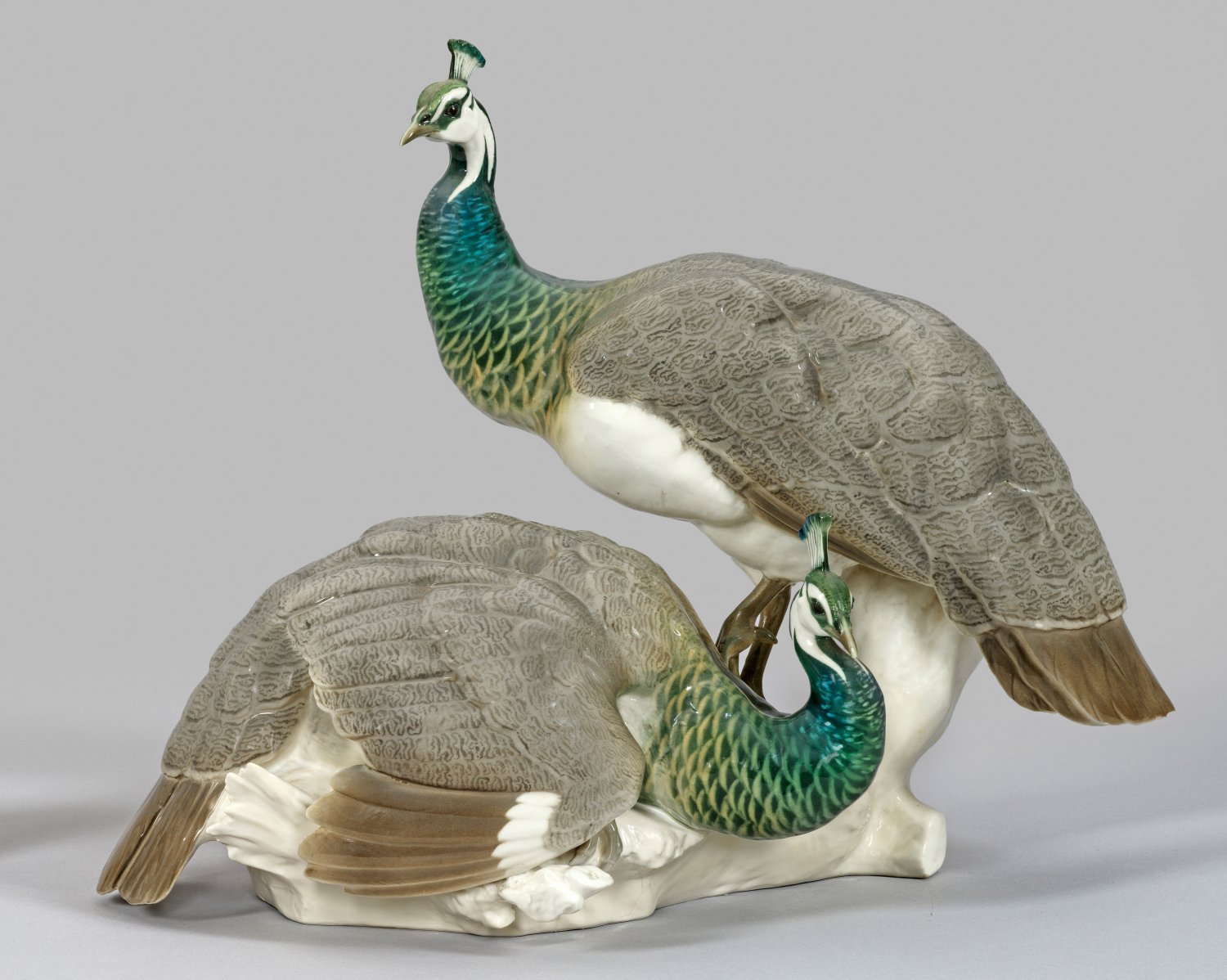 Auf einem unregelmäßigen Gesteinssockel die naturalistische Darstellung einer stehenden bzw. einer sitzenden Pfauhenne. Polychrome Unterglasurmalerei. Entw. Prof. Theodor Kärner, um 1906. Modell-Nr. 172. Unw. rest.; Ger. Haarrisse. Eingepresste Manufakturmarke. H. 34,5 cm. B. 43 cm.