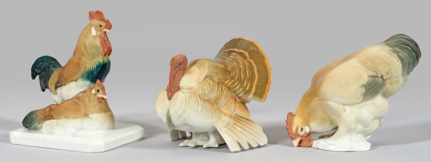 Auf profiliertem Rechteckssockel sitzende Henne mit stehendem Hahn bzw. sitzender Truthahn und pickender "Kochinchina-Hahn". Polychrome Unterglasurmalerei. Entw. von Hahn und Henne, Karl Heynen-Dumont, 1908. Entw. des Truthahns bzw. des "Kochinchina-Hahn", Wilhelm Carl Robra, 1909 und 1912. Teilw. Entw.-Bez. Teilw. herstellungsbed. Spannungsriss. Zepter- und Malereimarke. H. 12,5 - 16 cm.
