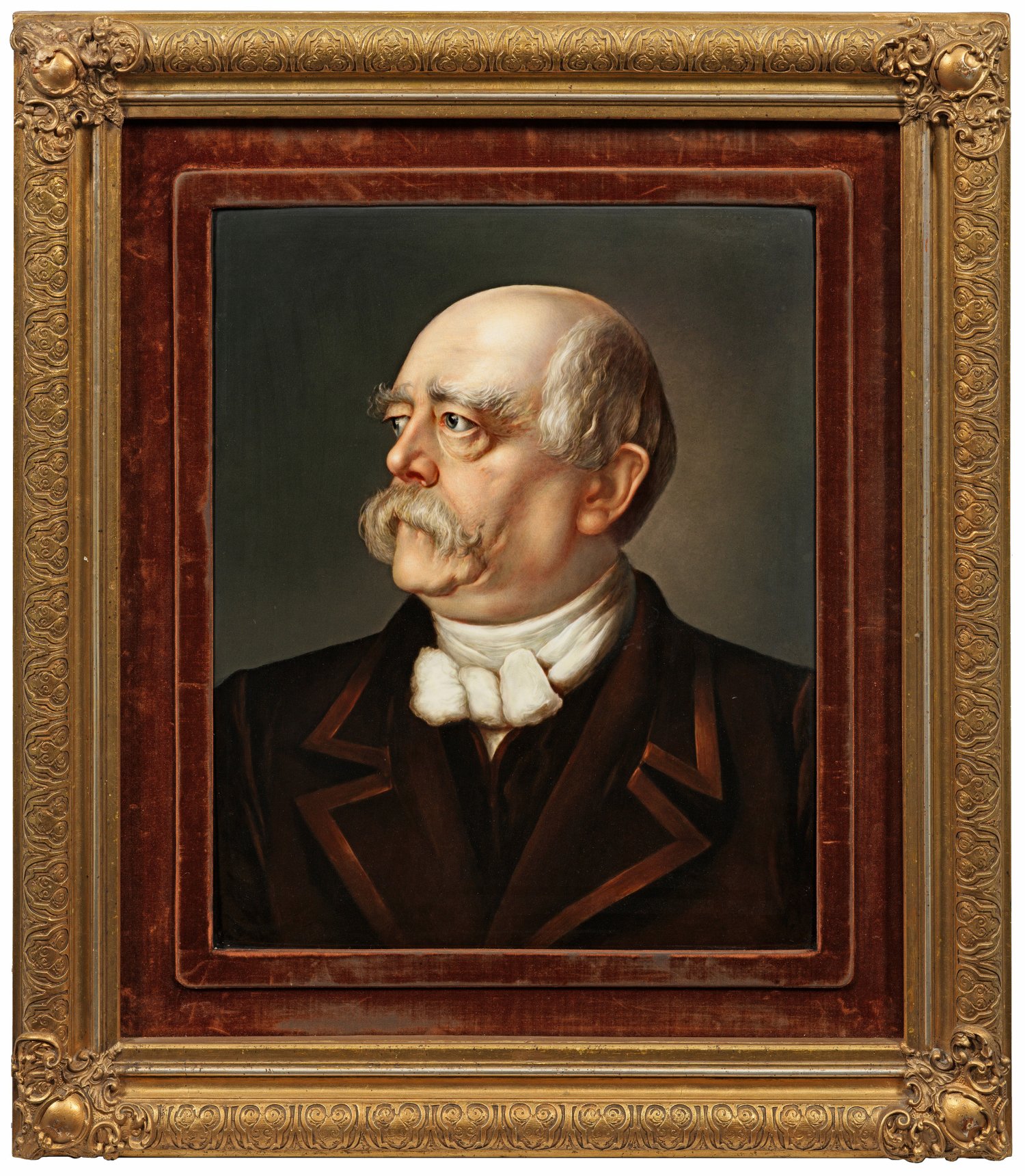 Repräsentatives Brustbildnis des Reichskanzlers Fürst Otto von Bismarck im Profil, einen Mantel mit profiliertem Kragen und hellem, zur Schleife gebundenen Halstuch tragend. Äußerst feine polychrome Malerei. Nach einem Gemälde Franz von Lenbachs um 1890, heute in der Städt. Galerie im Lenbachhaus, München. Verso altes Etikett des Kunstinstituts für Porzellanmalerei Merkel-Heine in Wiesbaden. Vergoldeter Stuckrahmen mit dunkelrotem Samtpassepartout. Eingepresste Zepter- mit KPM-Marke. Platte 56,5 cm x 46,5 cm. Rahmen 85 cm x 75 cm.