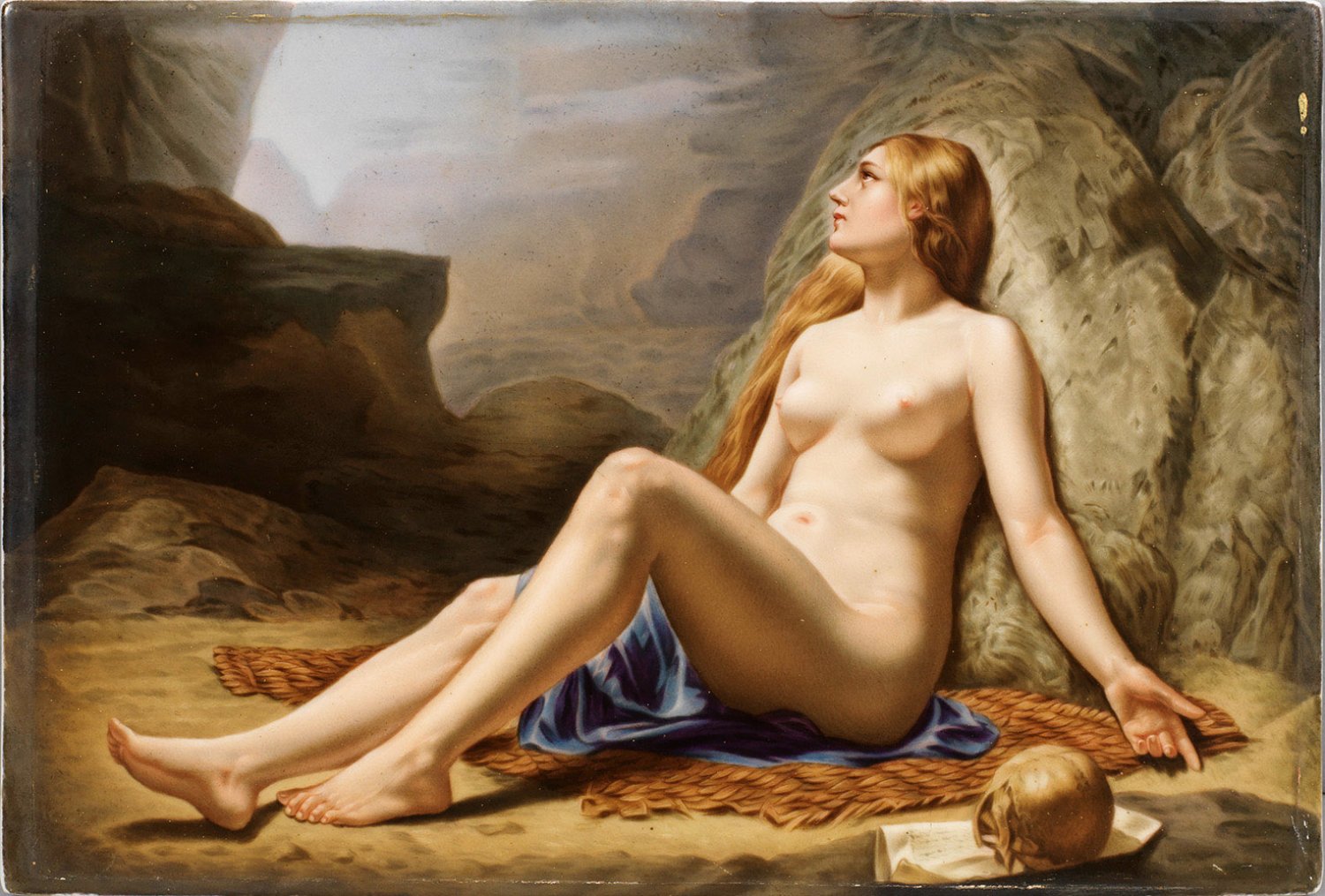 Vor karger, felsiger Landschaft sitzende, unbekleidete Heilige Maria Magdalena mit langem, gewelltem Haar und zum Himmel gerichtetem Blick. Seitlich liegender Totenschädel als Symbol der Askese und der Nichtigkeit. Äußerst feine polychrome Malerei. Eingepresste Zepter- mit KPM-Marke. 16 cm x 24 cm.