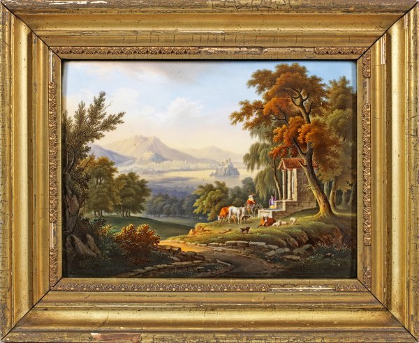 Rechteckige Bildplatte. In italienisierender, arkadischer Landschaft mit römischer Architektur rastendes Hirtenpaar mit ihren weidenden Tieren. Im Hintergrund weites Gebirgspanorama mit Stadtkulisse. Feine polychrome Malerei. Originaler, vergoldeter Stuckrahmen mit Ornamentleiste. Minim. Altersspuren. 28 cm x 38 cm. 41,5 cm x 51,5 cm.