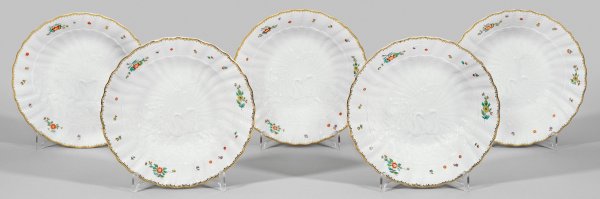Runde Form. Feiner, muschelförmiger Reliefdekor aus dem Schwanenservice (Schwanendessin). Im leicht vertieften Spiegel zwei auf dem Wasser schwimmende, einander zugewandte Schwäne zwischen hohem Schilf sowie stehender und fliegender Reiher. Auf der Fahne asiatische Blütenzweige und gestreute Blumen in Kakiemon-Manier. Gekämmter Goldrand. Schwertermarke. D. 25 cm.