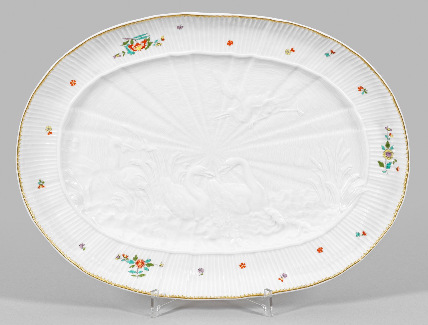 Im vertieften Spiegel feiner Reliefdekor aus zwei einander zugeneigten Schwänen sowie fliegendem und zwischen hohem Schilf stehendem Reiher. Auf der gerippten, ansteigenden Fahne Indianischer Blütendekor in polychromer Malerei. Gekämmte Goldkante. Entw. Johann Joachim Kaendler und Johann Friedrich Eberlein. Schwertermarke. 46 cm x 33 cm.