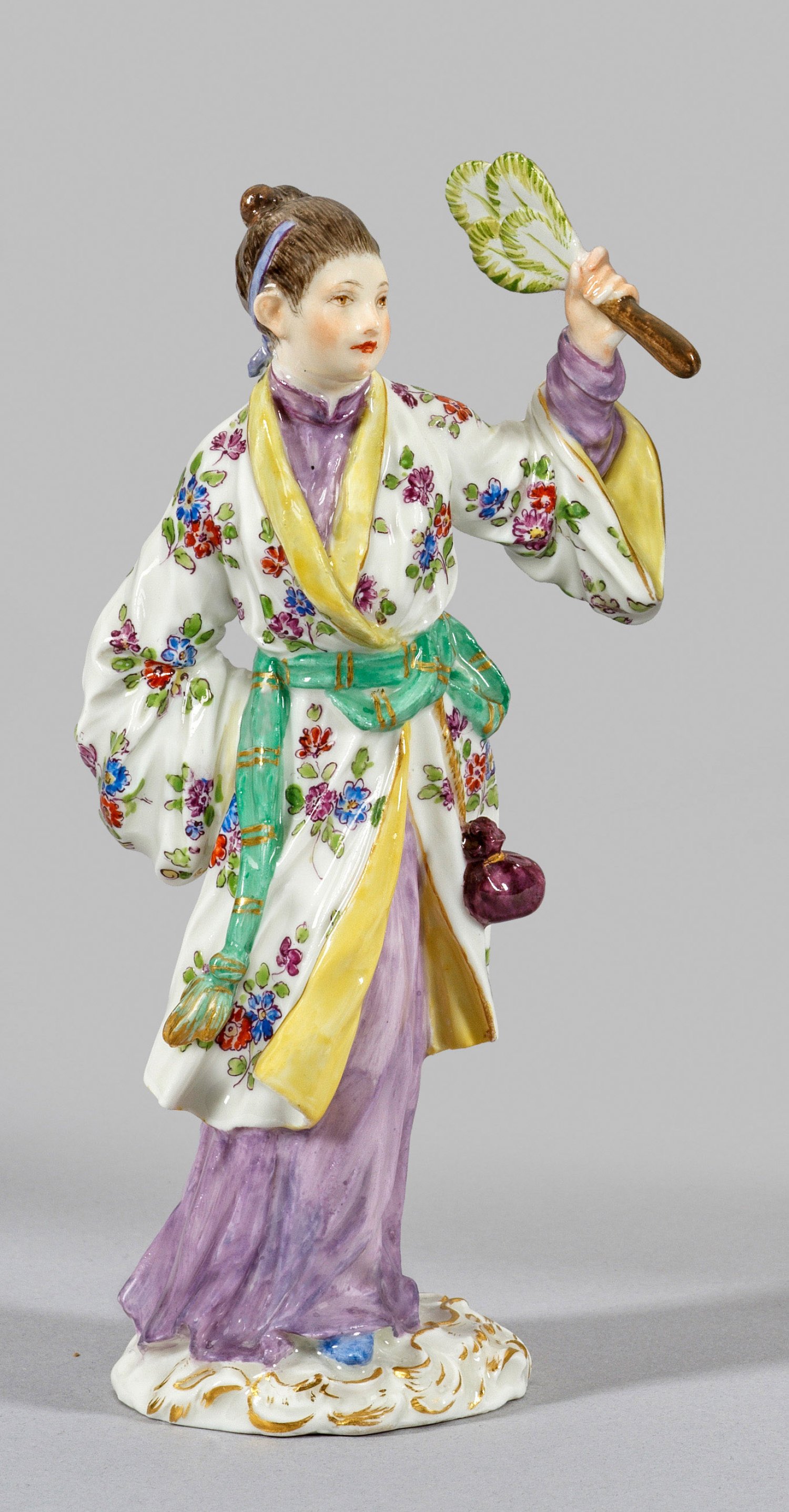 Auf rocaillereliefiertem Sockel stehende junge Japanerin im langen Gewand und blütengemusterten gegürteten Mantel, in ihrer linken, erhobenen Hand einen Fächer haltend. Polychrome Malerei mit Goldstaffage. Entw. Johann Joachim Kaendler. Modell-Nr. 2671. Minim. rest.; Schwertermarke. H. 16 cm.