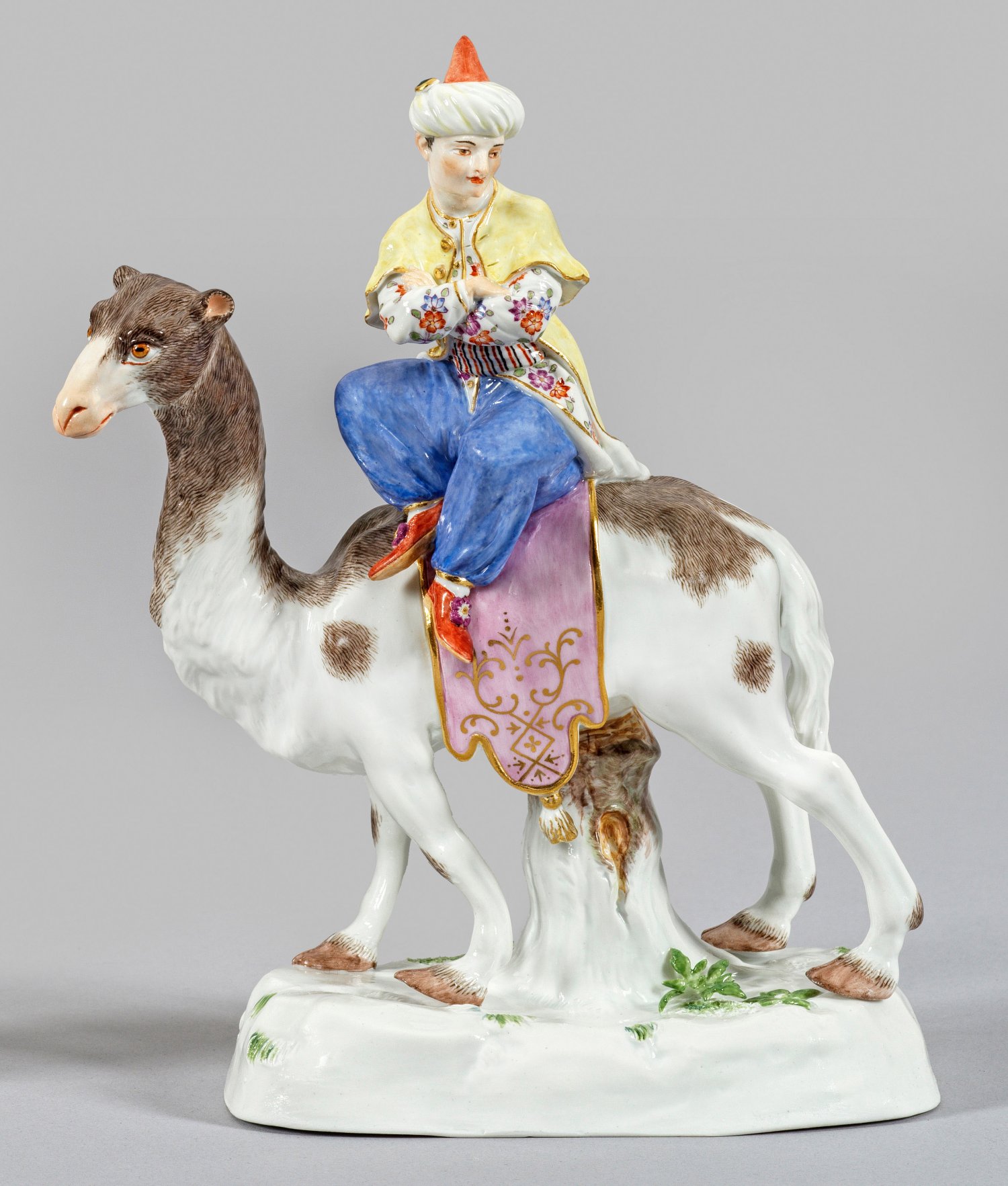 Rechteckig abgerundeter Natursockel, sparsam mit Blättern belegt. Auf einem Kamel mit Goldquastendecke sitzender, die Arme verschränkender Orientale in gelbem Mantel und mit Kakiemonblüten gemusterter Weste, einen edelsteinbesetzten Turban tragend. Polychrome Malerei mit Goldstaffage. Modell-Nr. 415. Minim. rest.; Schwertermarke. H. 21,5 cm.
