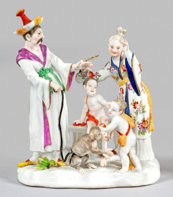 Auf einem unregelmäßigem, naturalistisch reliefiertem Sockel stehende, chinesische Familie. Mittig komponiert zwei Kinder. Seitlich stehender, schnurrbärtiger Vater in weißem, seegrün- und violettfarben abgesetztem Gewand mit rotem Strohhut, mit der rechten Hand einen am Boden sitzenden Affen an der Leine führend. Seitlich stehende, junge Mutter in einem mit Indianischen Blumen gemustertem Kimono, einen Handspiegel haltend. Polychrome Malerei mit Goldkonturierung. Entw. Johann Joachim Kaendler, Peter Reinicke oder Friedrich Elias Meyer, um 1745. Besch.; Partiell rest.; Schwertermarke. H. 17 cm.