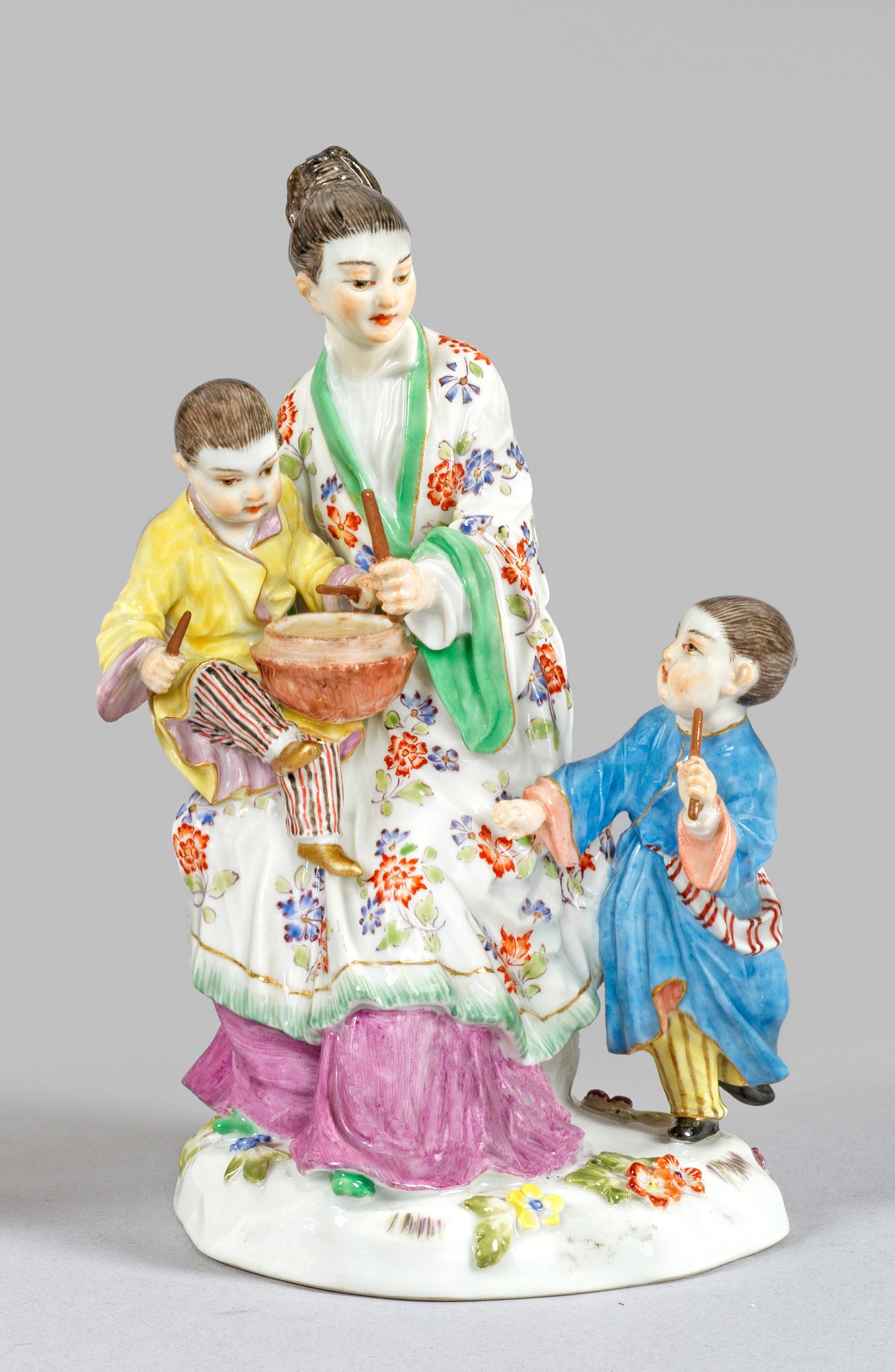 Auf Felssockel sitzende Japanerin mit Trommel schlagendem Kind auf dem Schoß, ein weiteres Kind mit Trommelstock in der Hand nähert sich von hinten. Polychrome Malerei mit wenig Gold. Entw. Johann Joachim Kaendler. Modell-Nr. 2679. Minim. rest.; Schwertermarke. H. 15 cm.