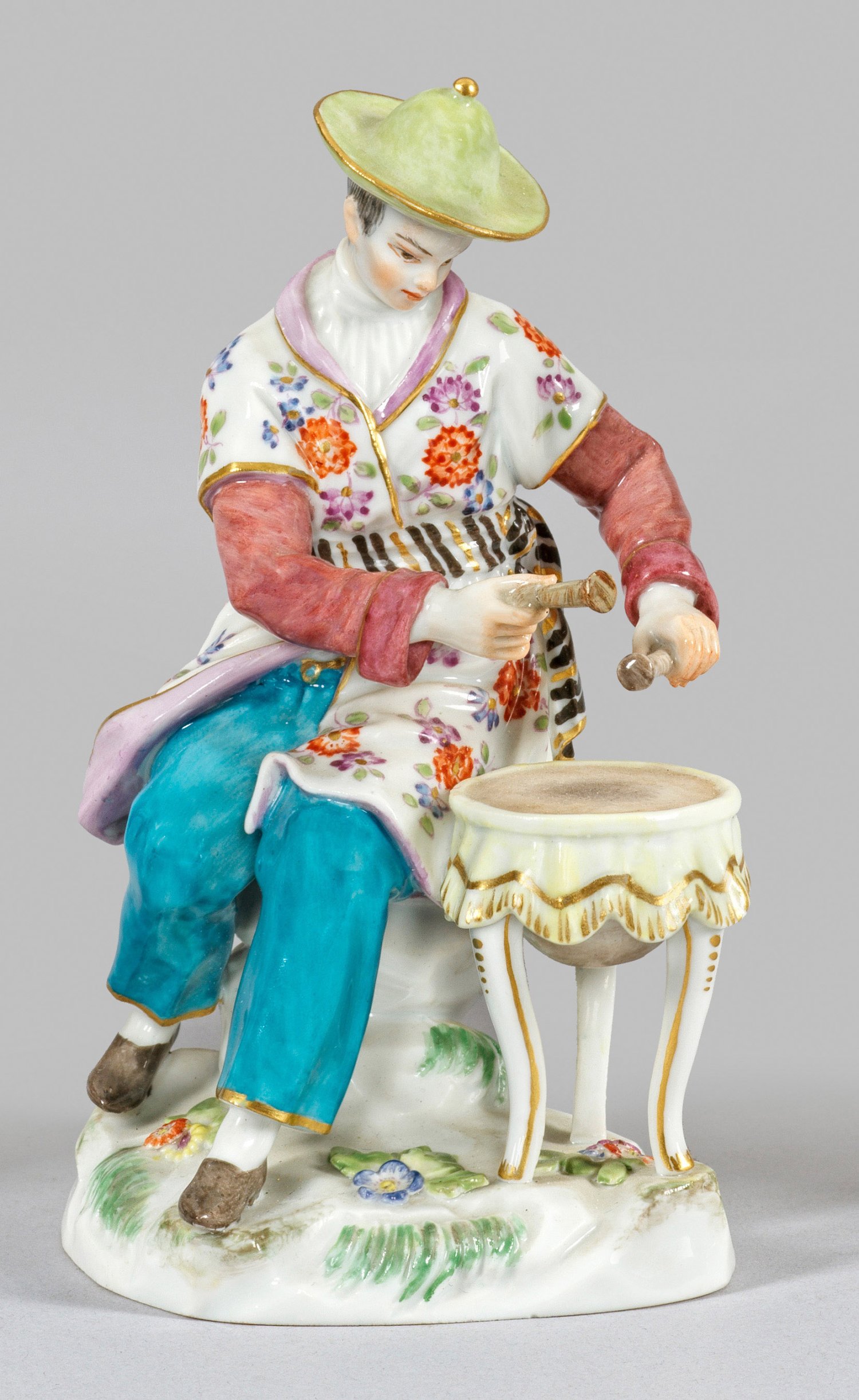 Auf einem Fels sitzender Japaner in einem, von Indianischen Blumen gemustertem Gewand, eine neben ihm stehende Tischpauke schlagend. Polychrome Malerei mit Goldstaffage. Entw. Friedrich Elias Meyer. Modell-Nr. E 44. Unw. rest.; Schwertermarke. H. 13 cm.