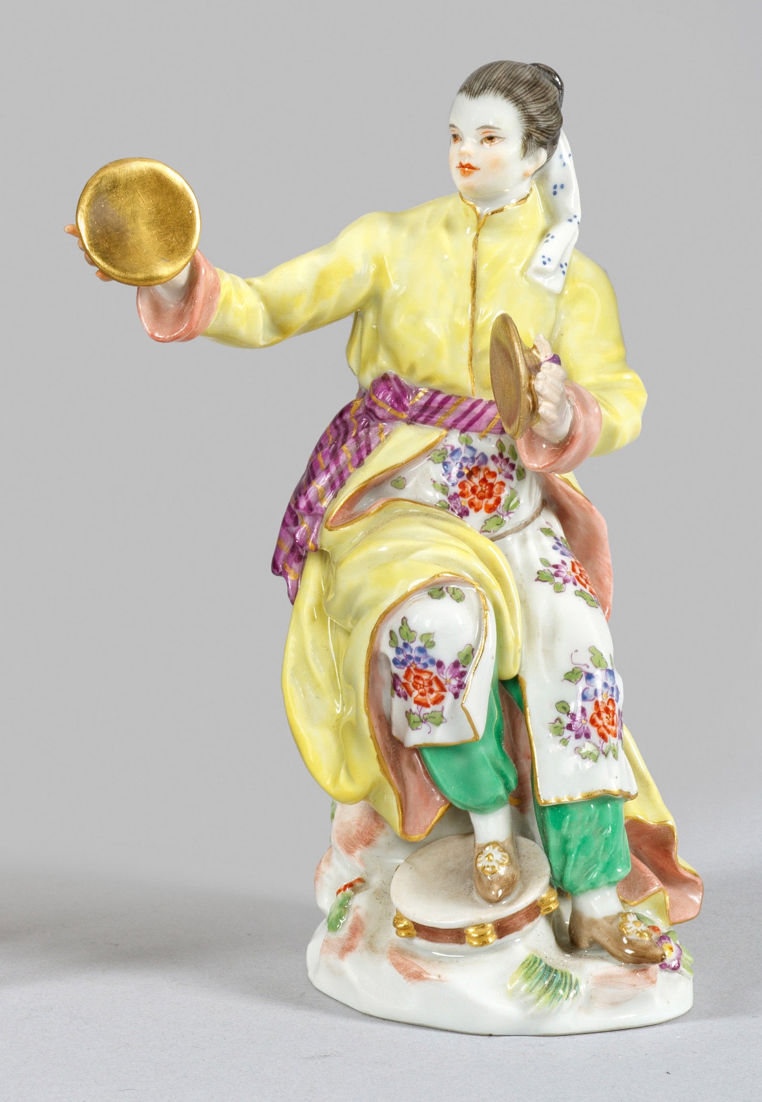 Auf Terrainsockel sitzende Japanerin, ein Becken schlagend. Polychrome Malerei mit reicher Goldstaffage. Entw. Friedrich Elias Meyer. Modell-Nr. 65665. Rest.; Schwertermarke. H. 13,5 cm.